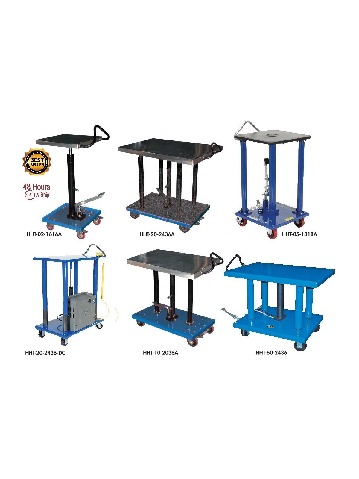 Hydraulic center post lifts tabletop with rigidity. Models with corner posts are telescoping to help stabilize and fully support the load during operation. Rolls smoothly on durable heavy duty casters. FOB Shipping Point.