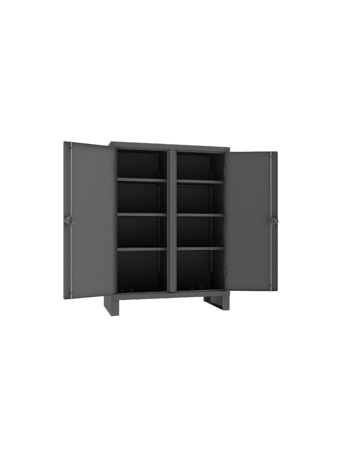 Feature rugged, all-welded 12 ga. steel construction and handsome flush door design. 4 reinforced steel shelves are adjustable on 2-1/2” centers. Includes extra heavy-duty hinge pins that secure doors to avoid sagging. Sturdy 3-point, cast steel locking handles have 3/8” dia. rods and provision for padlock (padlock not furnished). 6" high box style legs offer space for lift truck forks and can be lagged to the floor, constructed of 3/16" steel. Durable Gray powder coat finish. FOB Shipping Point.