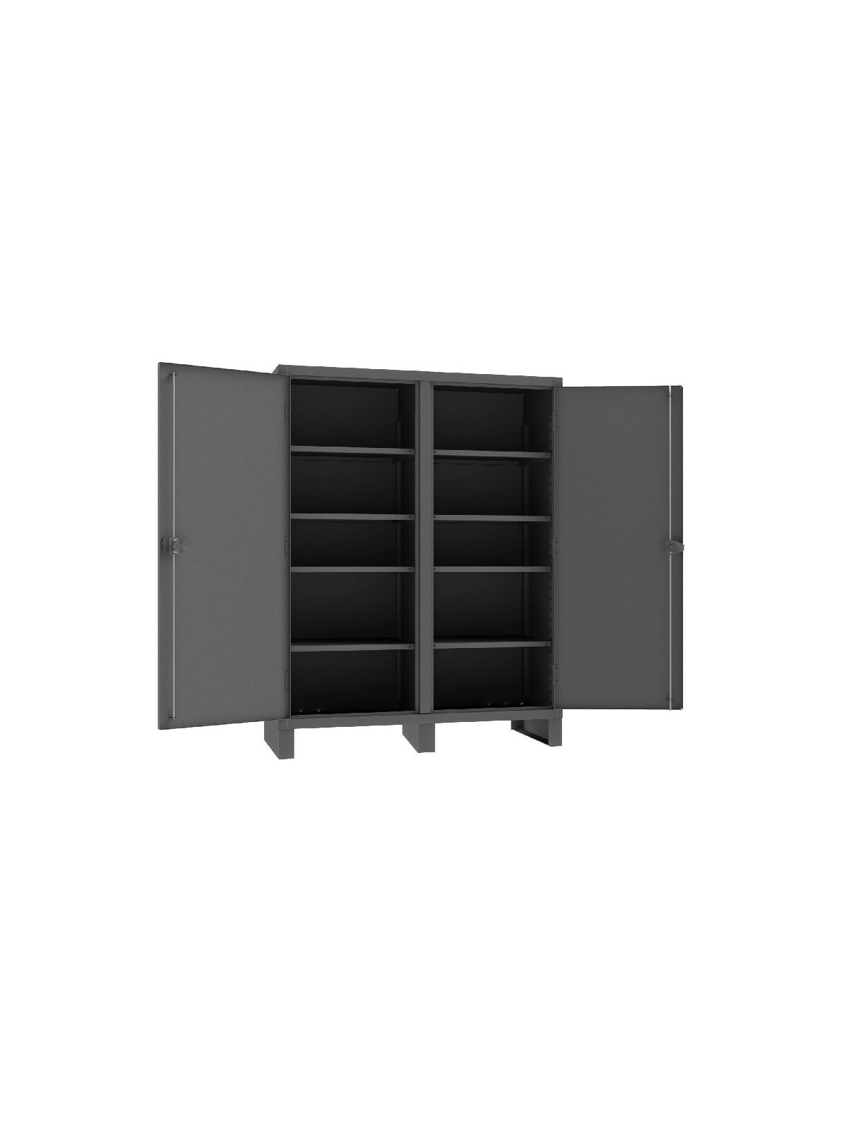 Feature rugged, all-welded 12 ga. steel construction and handsome flush door design. 4 reinforced steel shelves are adjustable on 2-1/2” centers. Includes extra heavy-duty hinge pins that secure doors to avoid sagging. Sturdy 3-point, cast steel locking handles have 3/8” dia. rods and provision for padlock (padlock not furnished).  6" high box style legs offer space for lift truck forks and can be lagged to the floor, constructed of 3/16" steel. Durable Gray powder coat finish. FOB Shipping Point.