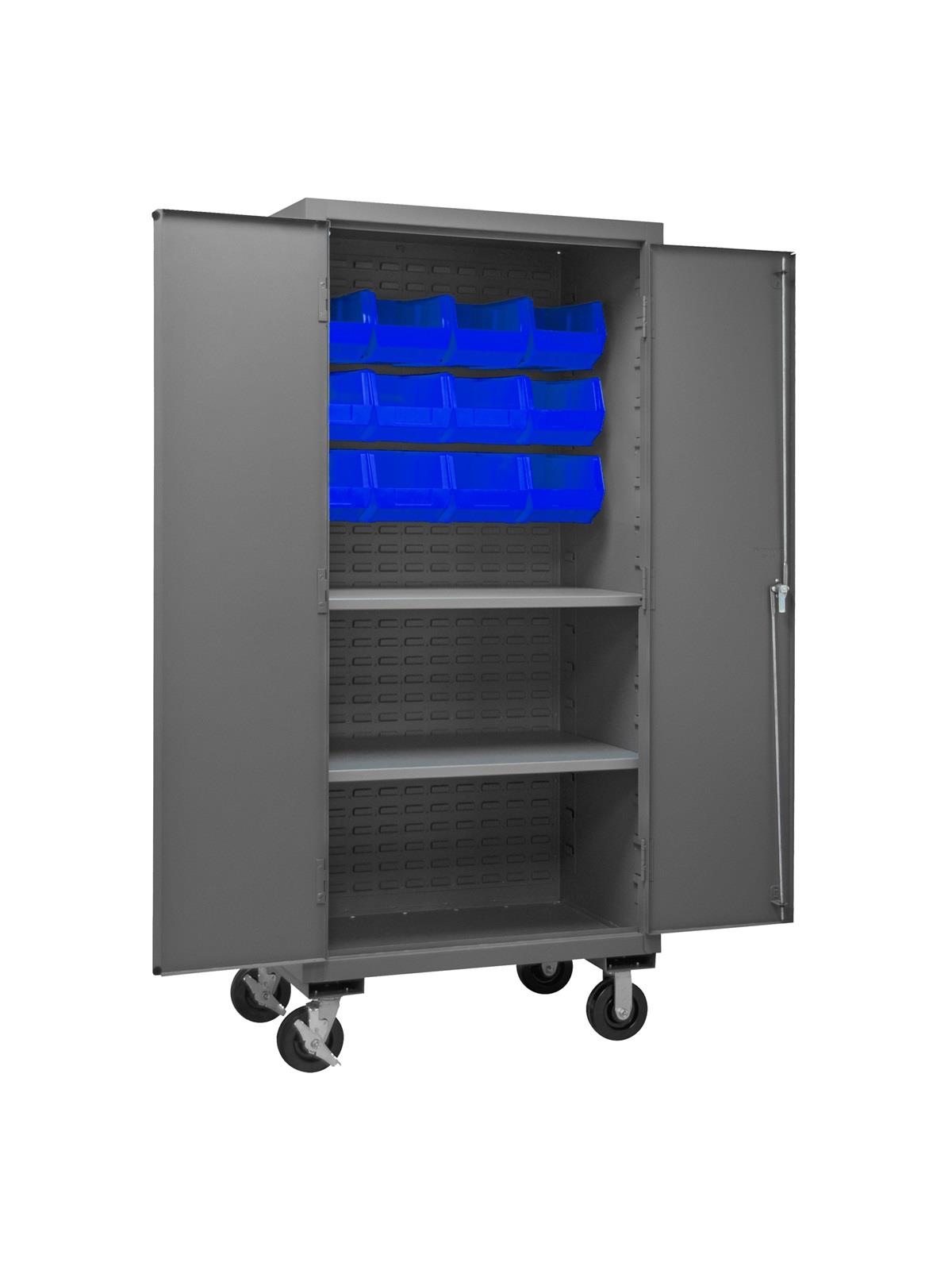 Heavy duty, all welded 14-gauge steel with 6" x 2" phenolic casters (2 rigid, 2 locking swivel). 3-point locking system with keyed handle and lock rods, 4 keys included. Side handle for easy maneuvering. Fully welded louvered panels reinforce back and hold Hook-On-Bins® and adjustable shelves rest on louvered panels and adjust on 4"centers. No tools required for installation. Hook-On-Bins® by Durham are included and install with no tools required. Gray textured powder coat finish. Available in three bin colors, Red (-1795), Blue (-5295), or Yellow (-95). FOB Shipping Point.