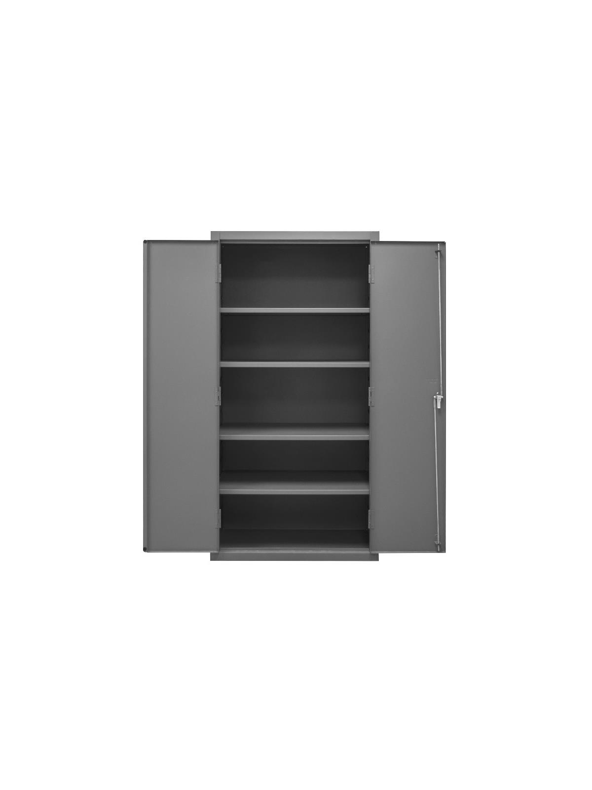 Industrial duty, all welded 16-gauge steel with 3-point locking system with keyed handle and lock rods, 4 keys included. Adjustable shelves rest on louvered panels and adjust on 4" centers. No tools required for installation. H2505 & H2506 models have 6"H base/legs which provide access for forklifts, pre-punched holes allow for lagging to the floor. (Constructed of 3/16" steel) Gray, textured powder coat finish. FOB Shipping Point.