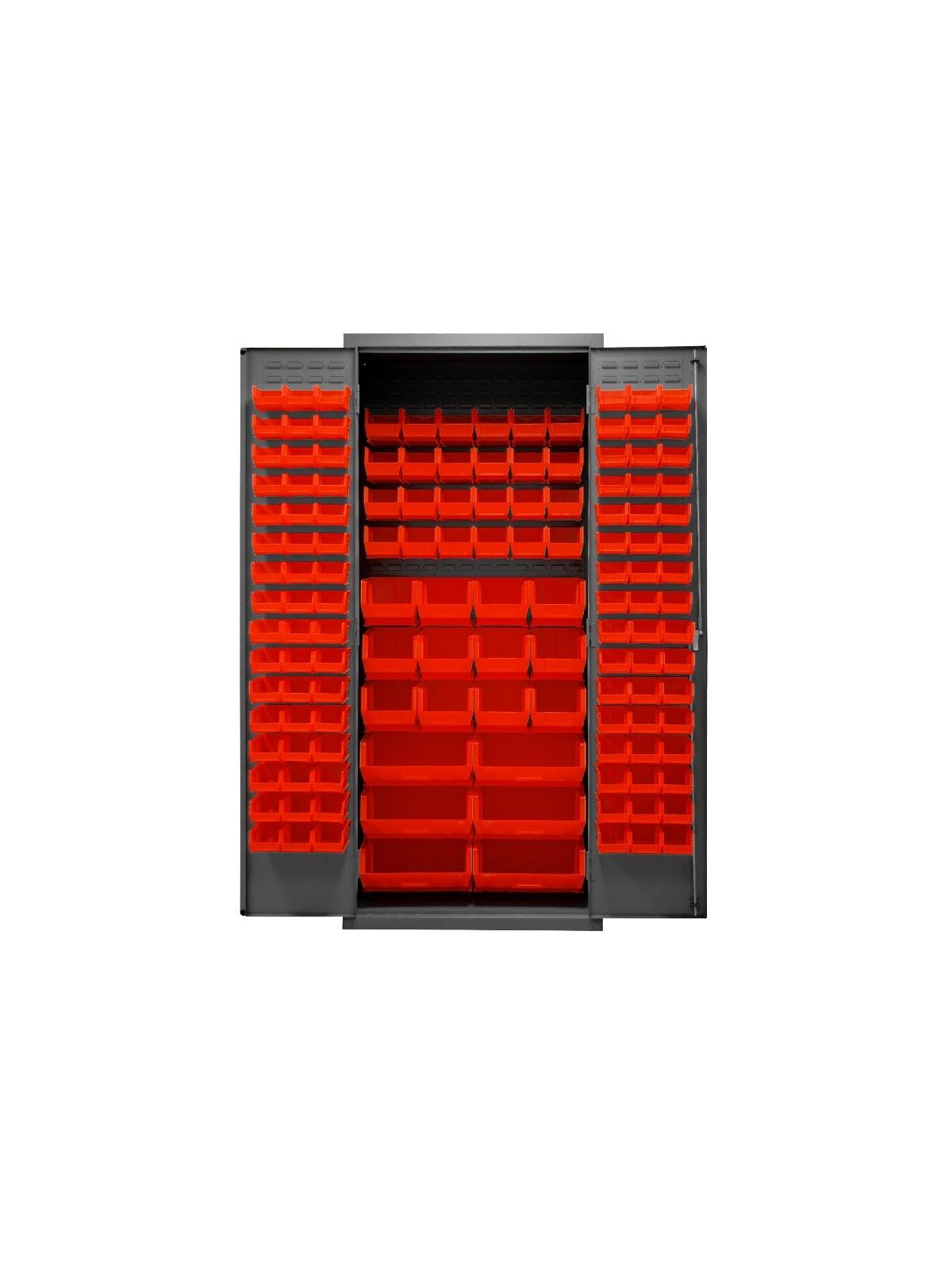 3-point locking system with keyed handle and lock rods, 4 keys included. Full height, formed and recessed doors with heavy duty, leaf hinges to prevent sagging and warping. Fully welded louvered panels reinforce door and accommodates Hook-On-Bins®. Hook-On-Bins® installed easily with no tools required. Hook-On-Bins® are included. Durable, gray textured powder coat finish. Available in three bin colors, Red (-1795), Blue (-5295), or Yellow (-95). FOB Shipping Point.