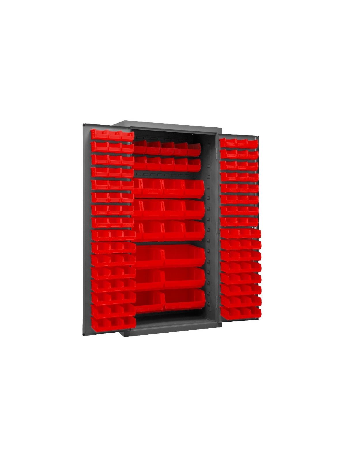 3-point locking system with keyed handle and lock rods, 4 keys included. Full height, formed and recessed doors with heavy duty, leaf hinges to prevent sagging and warping. Fully welded louvered panels reinforce door and accommodates Hook-On-Bins®. Hook-On-Bins® installed easily with no tools required. Hook-On-Bins® are included. Durable, gray textured powder coat finish. Available in three bin colors, Red (-1795), Blue (-5295), or Yellow (-95). FOB Shipping Point.