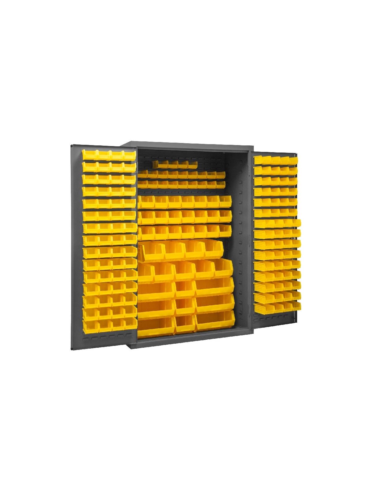 3-point locking system with keyed handle and lock rods, 4 keys included. Full height, formed and recessed doors with heavy duty, leaf hinges to prevent sagging and warping. Fully welded louvered panels reinforce door and accommodates Hook-On-Bins®. Hook-On-Bins® installed easily with no tools required. Hook-On-Bins® are included. Durable, gray textured powder coat finish. Available in three bin colors, Red (-1795), Blue (-5295), or Yellow (-95). FOB Shipping Point.