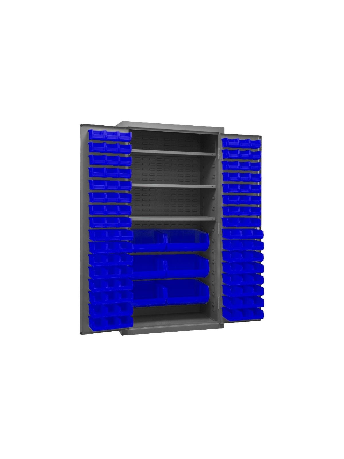 3-point locking system with keyed handle and lock rods, 4 keys included. Full height, formed and recessed doors with heavy duty, leaf hinges to prevent sagging and warping. Adjustable shelves rest on louvered panels and adjust on 4" centers. No tools required for installation. Fully welded louvered panels reinforce door and accommodate Hook-On Bins®. Hook-On Bins® installed easily with no tools required. Hook-On Bins® are included. Durable, gray, textured powder coat finish. Available in three bin colors, Red (-1795), Blue (-5295), or Yellow (-95). FOB Shipping Point.