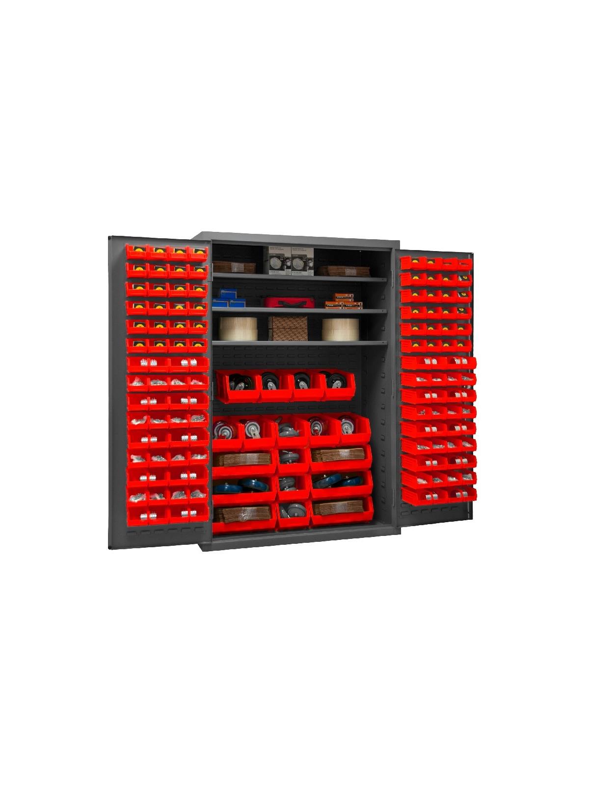 3-point locking system with keyed handle and lock rods, 4 keys included. Full height, formed and recessed doors with heavy duty, leaf hinges to prevent sagging and warping. Adjustable shelves rest on louvered panels and adjust on 4" centers. No tools required for installation. Fully welded louvered panels reinforce door and accommodate Hook-On Bins®. Hook-On Bins® installed easily with no tools required. Hook-On Bins® are included. Durable, gray, textured powder coat finish. Available in three bin colors, Red (-1795), Blue (-5295), or Yellow (-95). FOB Shipping Point.