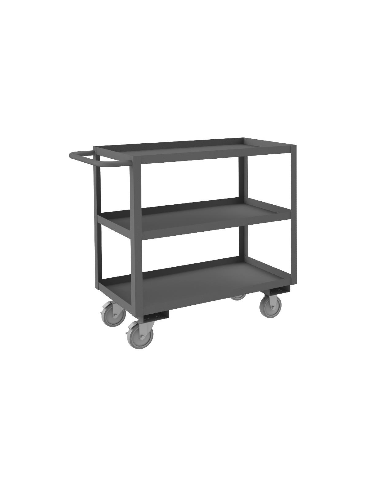 Shelf carts are constructed with 1-1/2" x 1/8" angle iron uprights for added strength. Heavy duty 14 gauge steel shelves. Sturdy tubular push handle. Perfect for transporting heavier parts or stock items. Shelf Stock Carts are available in 1,200 lbs. or 3,000 lbs. capacities. FOB Shipping Point.