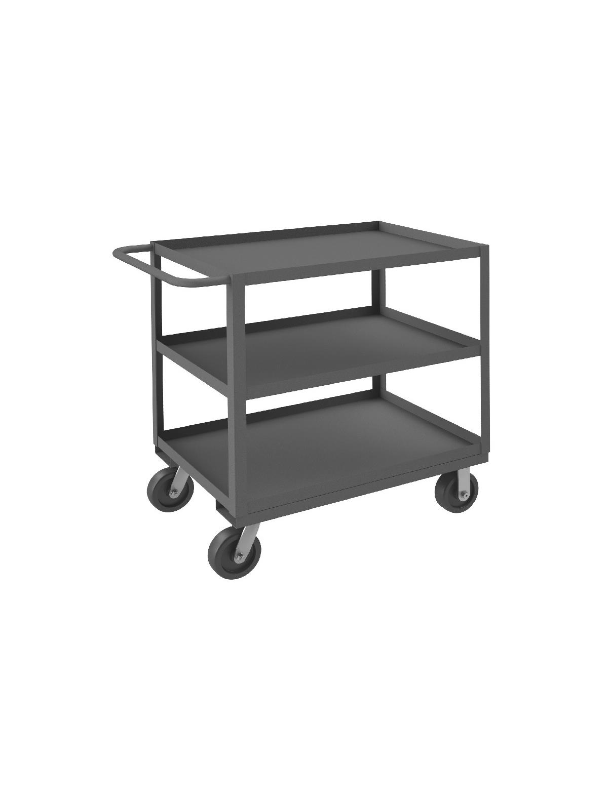 Shelf carts are constructed with 1-1/2" x 1/8" angle iron uprights for added strength. Heavy duty 14 gauge steel shelves. Sturdy tubular push handle. Perfect for transporting heavier parts or stock items. Shelf Stock Carts are available in 1,200 lbs. or 3,000 lbs. capacities. FOB Shipping Point.
