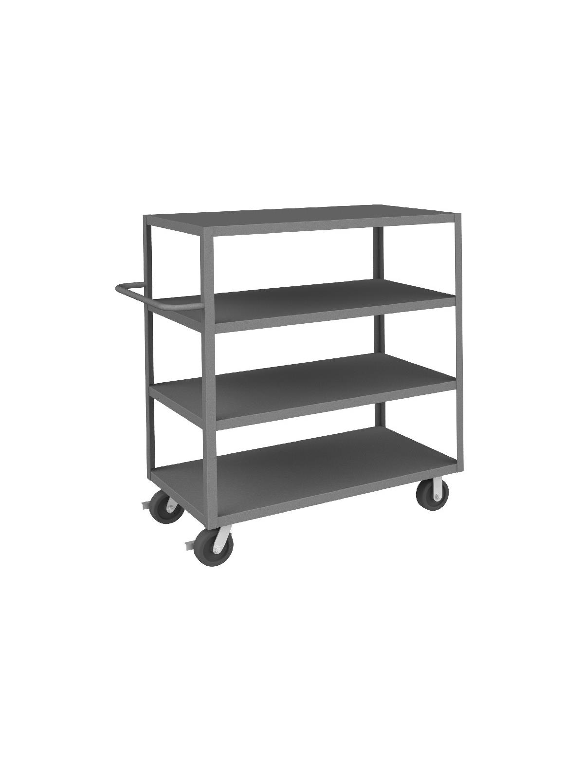 Shelf carts are constructed with 1-1/2" x 1/8" angle iron uprights for added strength. Heavy duty 14 gauge steel shelves. Sturdy tubular push handle. Perfect for transporting heavier parts or stock items. Shelf Stock Carts are available in 1,200 lbs. or 3,000 lbs. capacities. FOB Shipping Point.