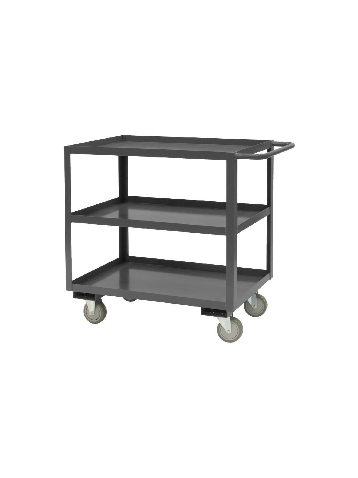 Shelf carts are constructed with 1-1/2" x 1/8" angle iron uprights for added strength. Heavy duty 14 gauge steel shelves. Sturdy tubular push handle. Perfect for transporting heavier parts or stock items. Shelf Stock Carts are available in 1,200 lbs. or 3,000 lbs. capacities. FOB Shipping Point.