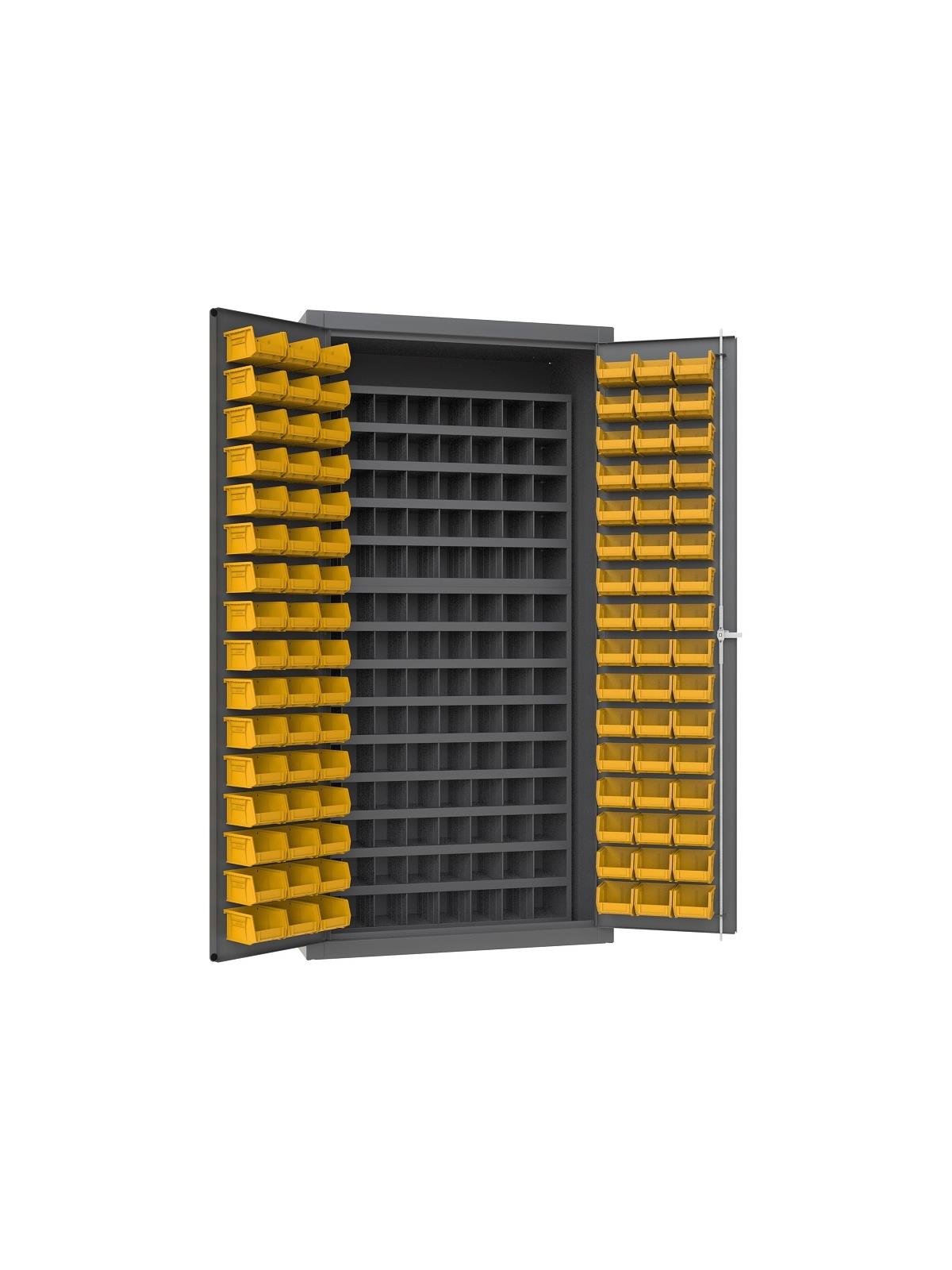Cabinets are heavy duty 14 gauge construction and feature 2 adjustable shelves and louvered panels on doors for use with bins included. Doors have fully welded piano hinges and can hold up to 650 lbs. (weight evenly distributed). 96 Hook-on Bins® are also included. H3501-DLP-60DR11-96-2S-95 comes with 60 Jumbo, 3-1/2" H drawers, each with 2 dividers adjustable on 1" centers (extra dividers are available). H3501-DLP-72/40B-96-95 has 12" deep, 112 pigeon hole bins enclosed - perfect for storage of fasteners, high value small parts and more. Available in Gray powder coat finish. Ships fully assembled. FOB Shipping Point.