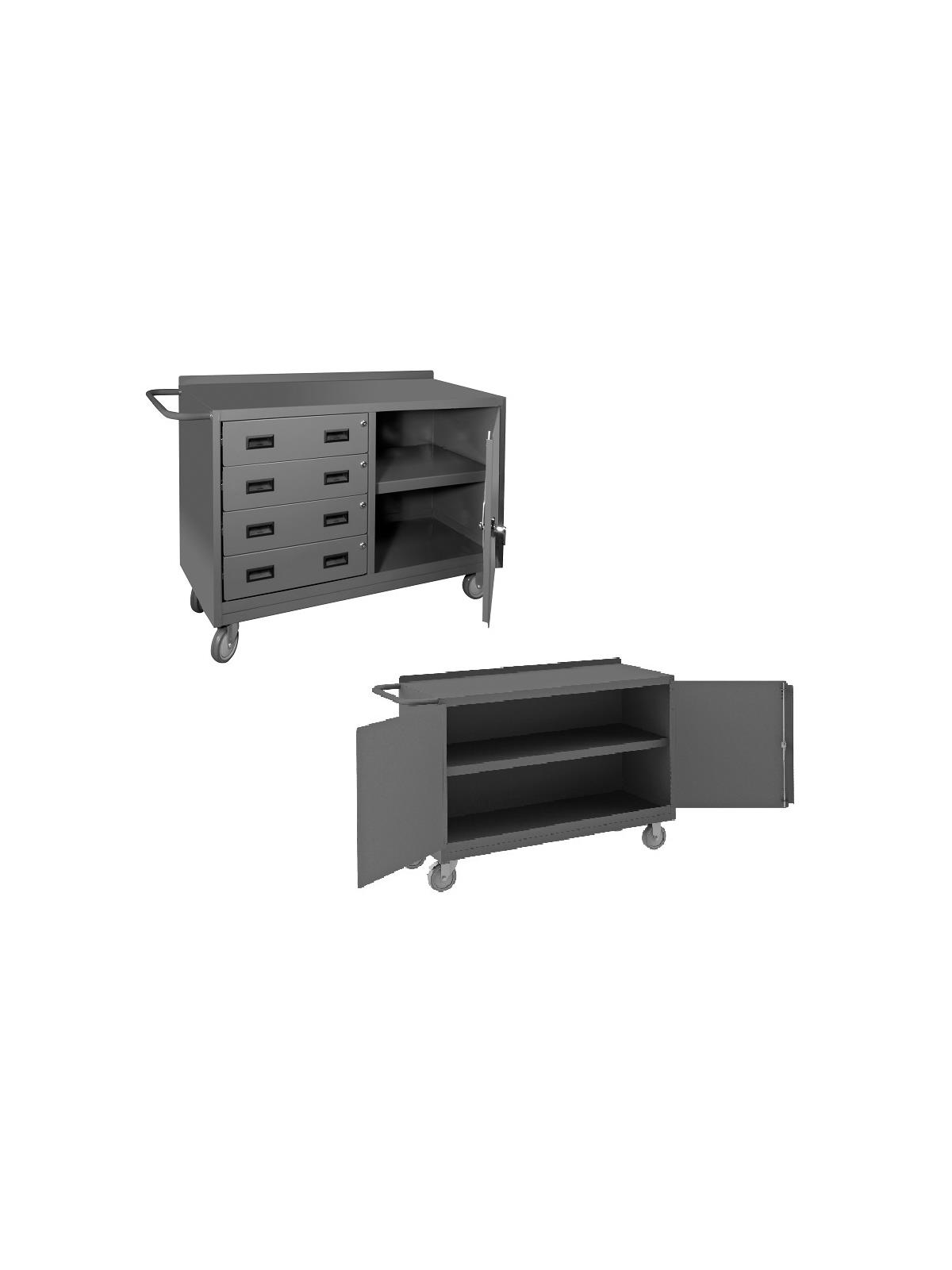 Use these rugged cabinets as maintenance or work stations on wheels. Built from heavy gauge steel for durability. Doors swing on full-piano hinge and single point locking handle. Ball bearing slide drawers (20-7/16"W x 14-11/16"D x 5-7/8"H) feature pull handle and keyed-alike cylinder lock. 3"H backstop. Rolls on 5" polyurethane casters (2 rigid, 2 swivel). Gray powder coat finish. All welded and ready to go. FOB Shipping Point.