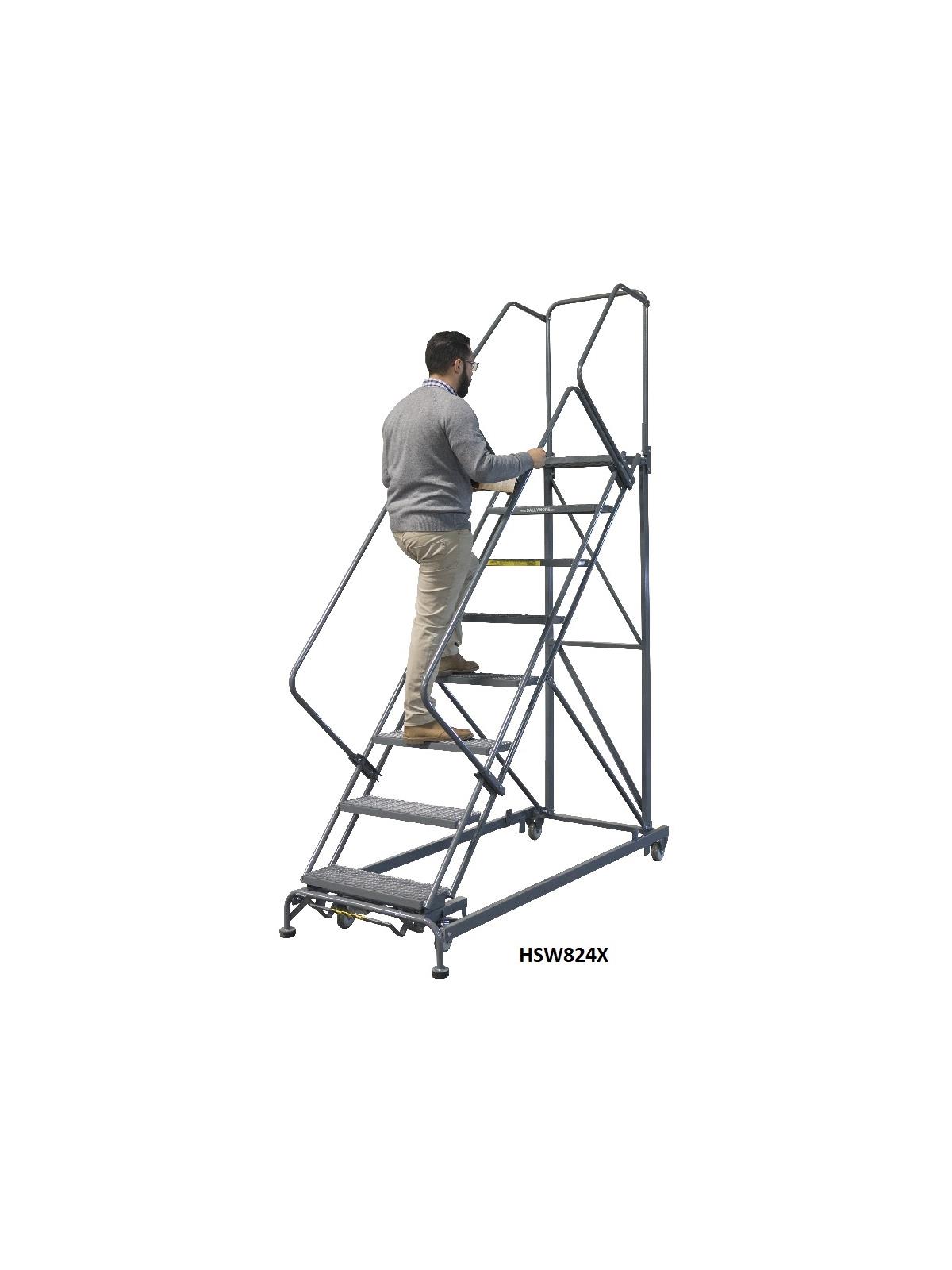 Unique 50° stairway slope for easy descent. Sturdy 450 lb. capacity. 7"D intermediate step. Easy operating lockstep secures ladder to the floor. Tread types available: Serrated Grating (G), Expanded Metal (X), Perforated Step (P), and Abrasive Mat (R). Ladders ship knocked down for freight cost savings, or setup (SU), see Related Items tab for pricing. Gray Powder coat finish. FOB Shipping Point.