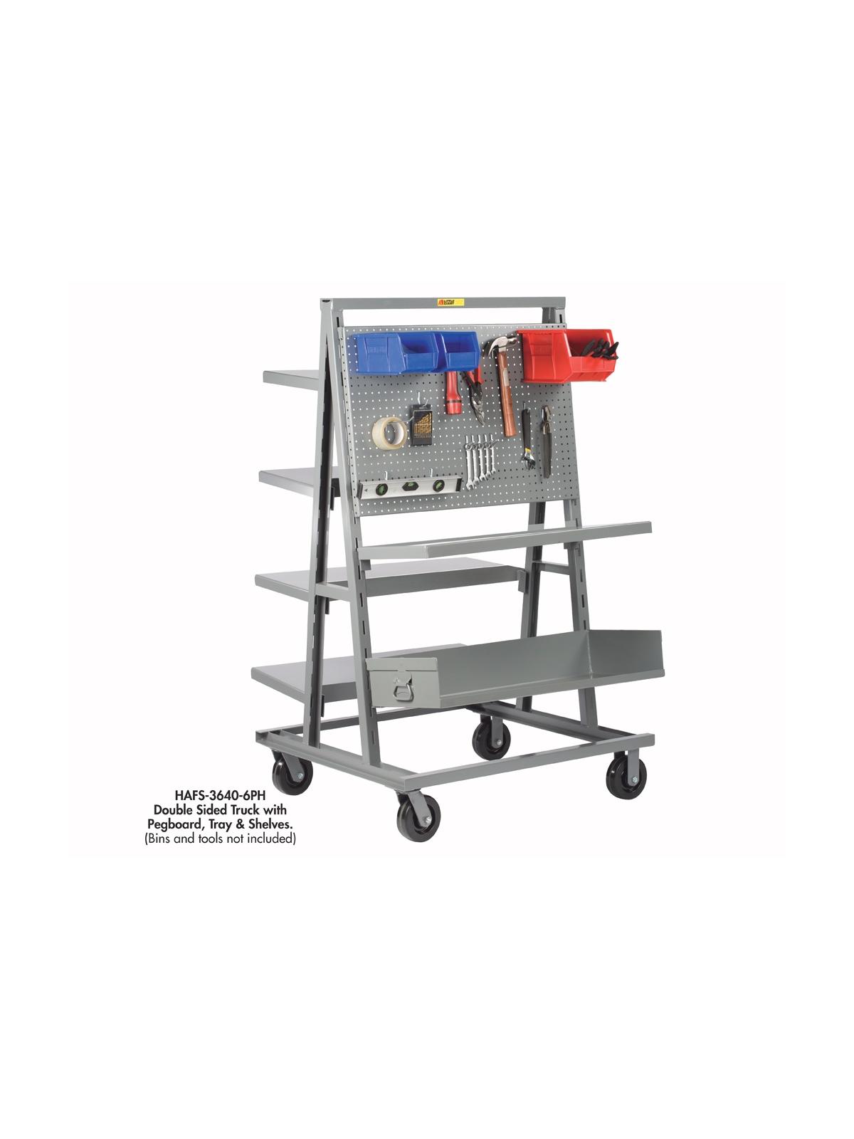 Slotted uprights accept your choice of optional hook-on trays, shelves, or pegboard panels. Rolls smoothly on 6 x 2" phenolic casters, 2 swivel and 2 rigid. Available single or double sided. Optional accessories include Trays, Shelves, and Pegboard Panels. Order truck and accessories separately. FOB Shipping Point.