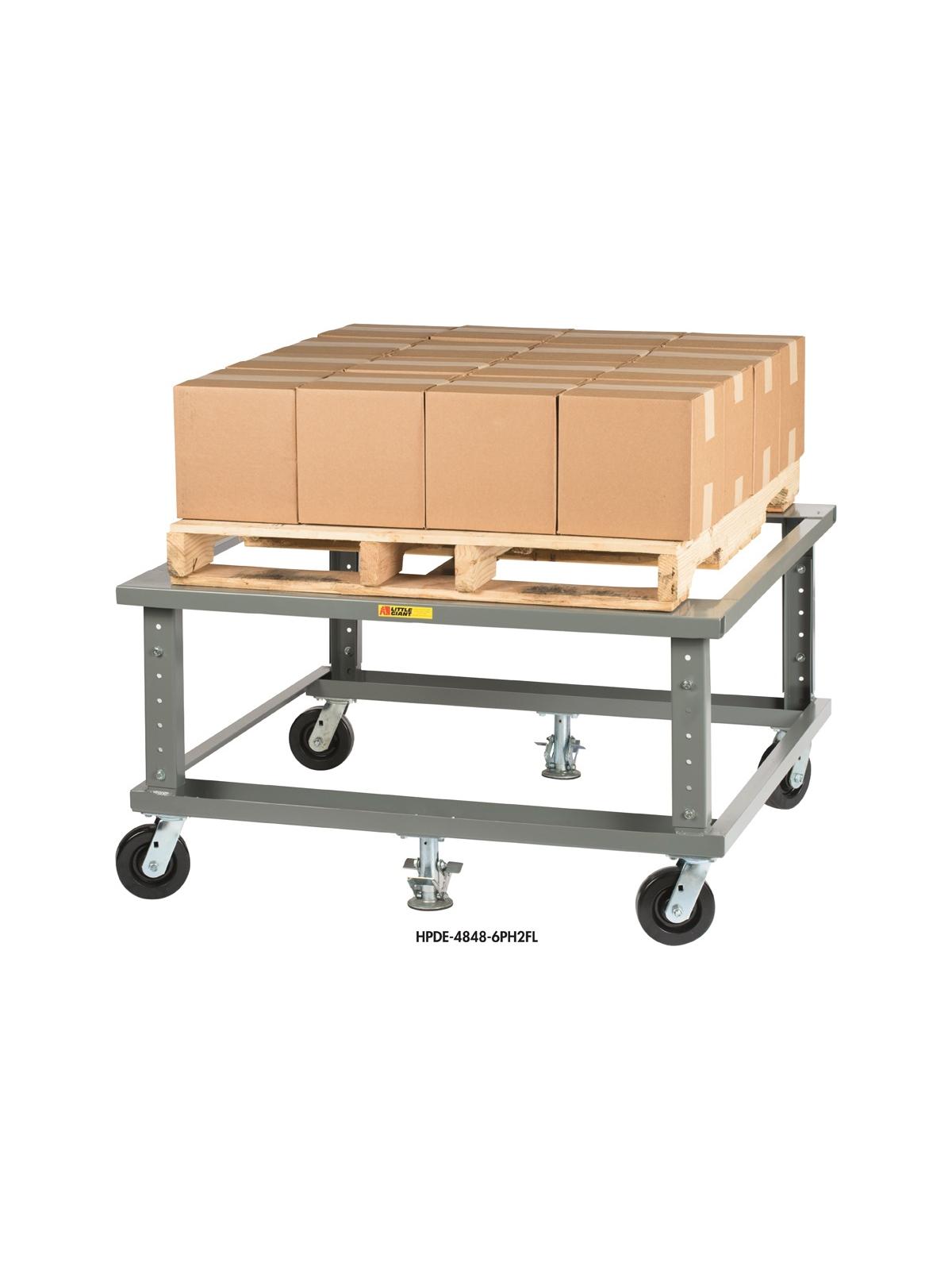 Skid-sized deck is raised to a comfortable work height to lessen bending and back strain. Platform height is adjustable between 24" and 34" in 2" increments to optimize ergonomic height for bending and lifting. Rolls smoothly on 6" swivel casters with phenolic wheels. Dual floor locks keep unit in place when loading and unloading. Available with a 12 gauge solid or open deck. All-welded steel construction. Powder coated for durability. Ships fully assembled. FOB Shipping Point.