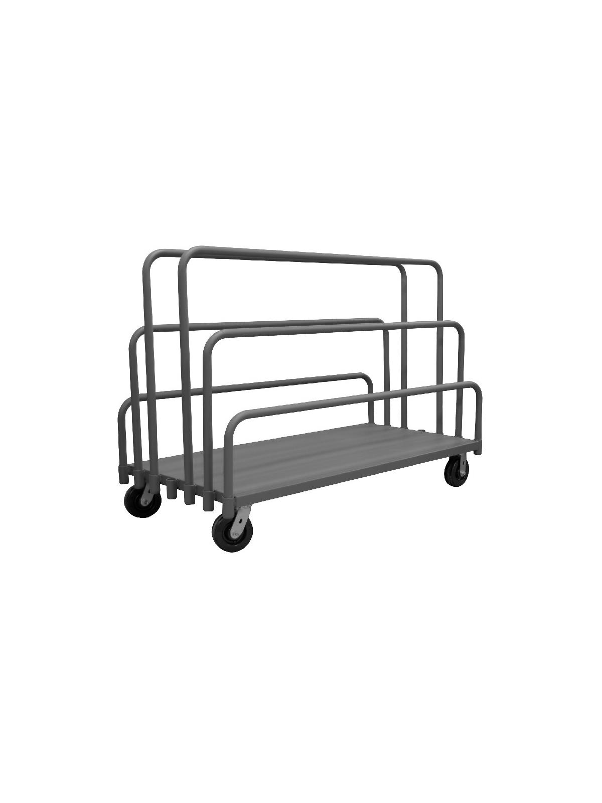 Easy to access and pick up on-board product. Create multiple opening sizes by adjusting dividers. All casters: 2 rigid, 2 swivel. Allows for the storage and transportation of various sizes of panels and product. Gray, textured, powder coat finish. FOB Shipping Point.
