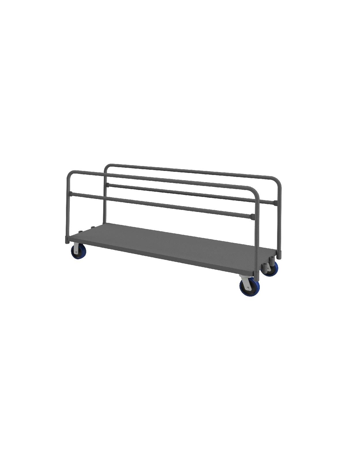 Easy to access and pick up on-board product. Create multiple opening sizes by adjusting dividers. All casters: 2 rigid, 2 swivel. Allows for the storage and transportation of various sizes of panels and product. Gray, textured, powder coat finish. FOB Shipping Point.
