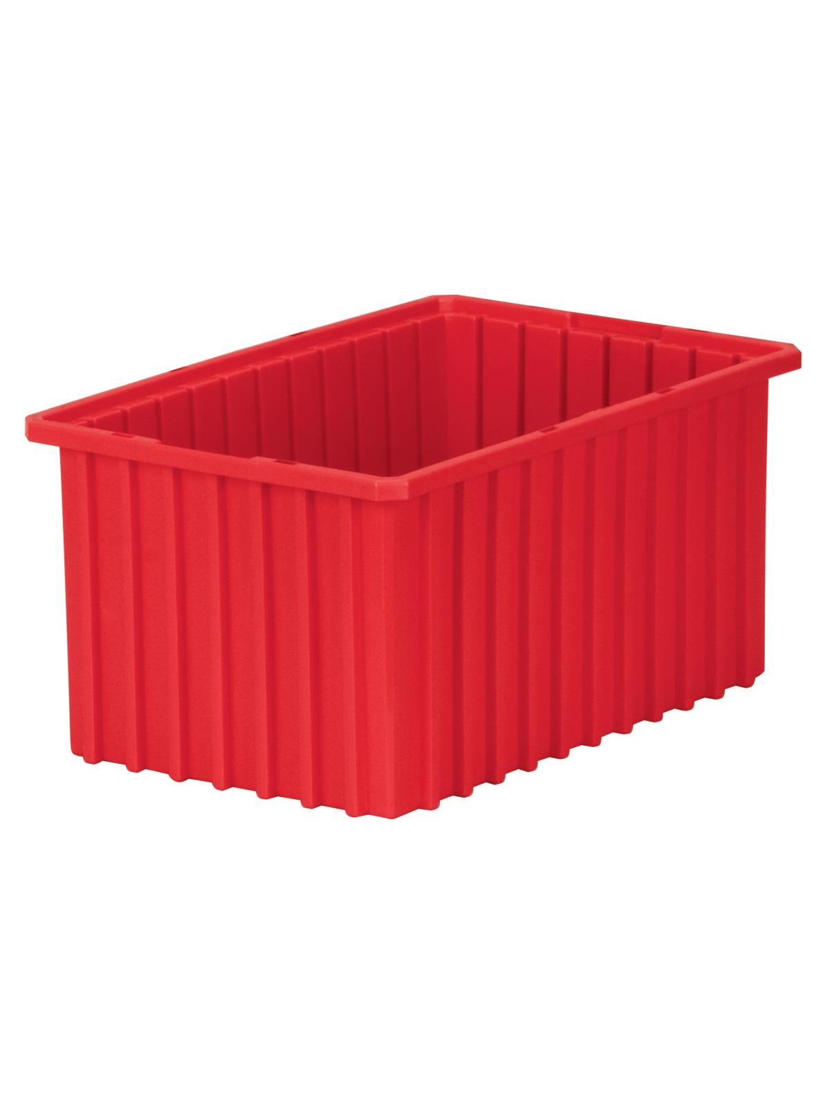 Intersecting dividers allow the container to be subdivided in separate compartments as small as 1-1/8" sq. Injection-molded from high density polyethylene -- resists most solvents and chemicals. Compatible with most racks, shelving and automated material handling equipment. Available in Red, Blue, or Gray. Dividers and lids sold separately. FOB Shipping Point.