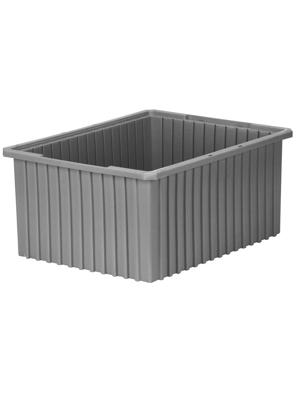 Intersecting dividers allow the container to be subdivided in separate compartments as small as 1-1/8" sq. Injection-molded from high density polyethylene -- resists most solvents and chemicals. Compatible with most racks, shelving and automated material handling equipment. Available in Red, Blue, or Gray. Dividers and lids sold separately. FOB Shipping Point.