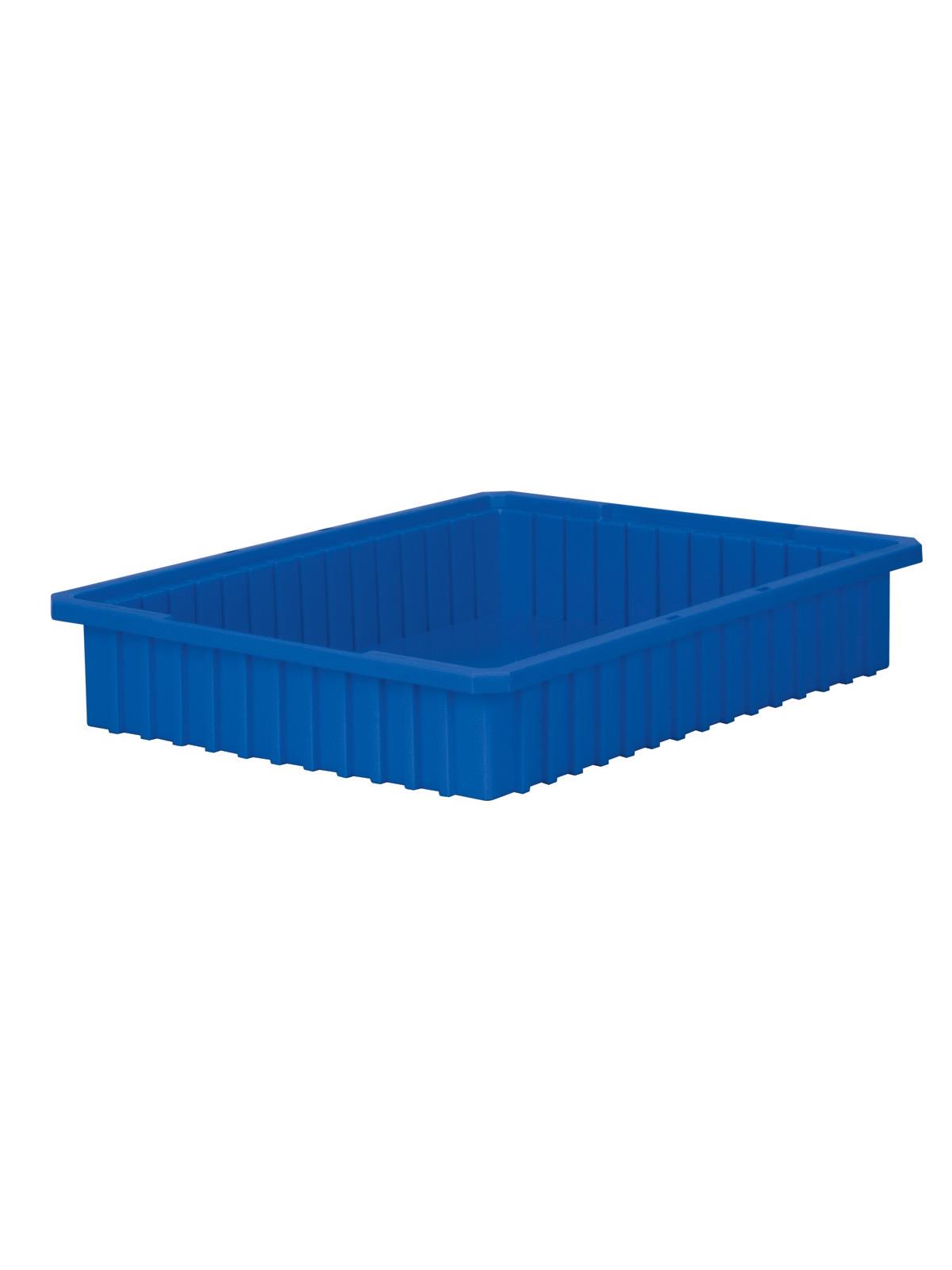Intersecting dividers allow the container to be subdivided in separate compartments as small as 1-1/8" sq. Injection-molded from high density polyethylene -- resists most solvents and chemicals. Compatible with most racks, shelving and automated material handling equipment. Available in Red, Blue, or Gray. Dividers and lids sold separately. FOB Shipping Point.