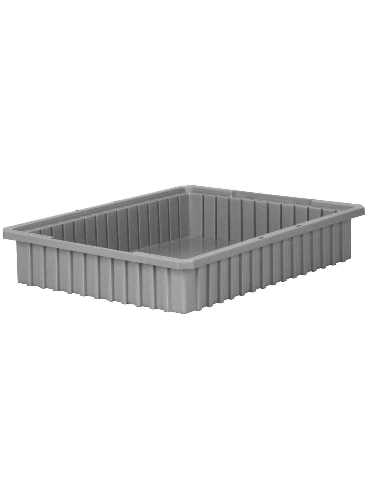 Intersecting dividers allow the container to be subdivided in separate compartments as small as 1-1/8" sq. Injection-molded from high density polyethylene -- resists most solvents and chemicals. Compatible with most racks, shelving and automated material handling equipment. Available in Red, Blue, or Gray. Dividers and lids sold separately. FOB Shipping Point.