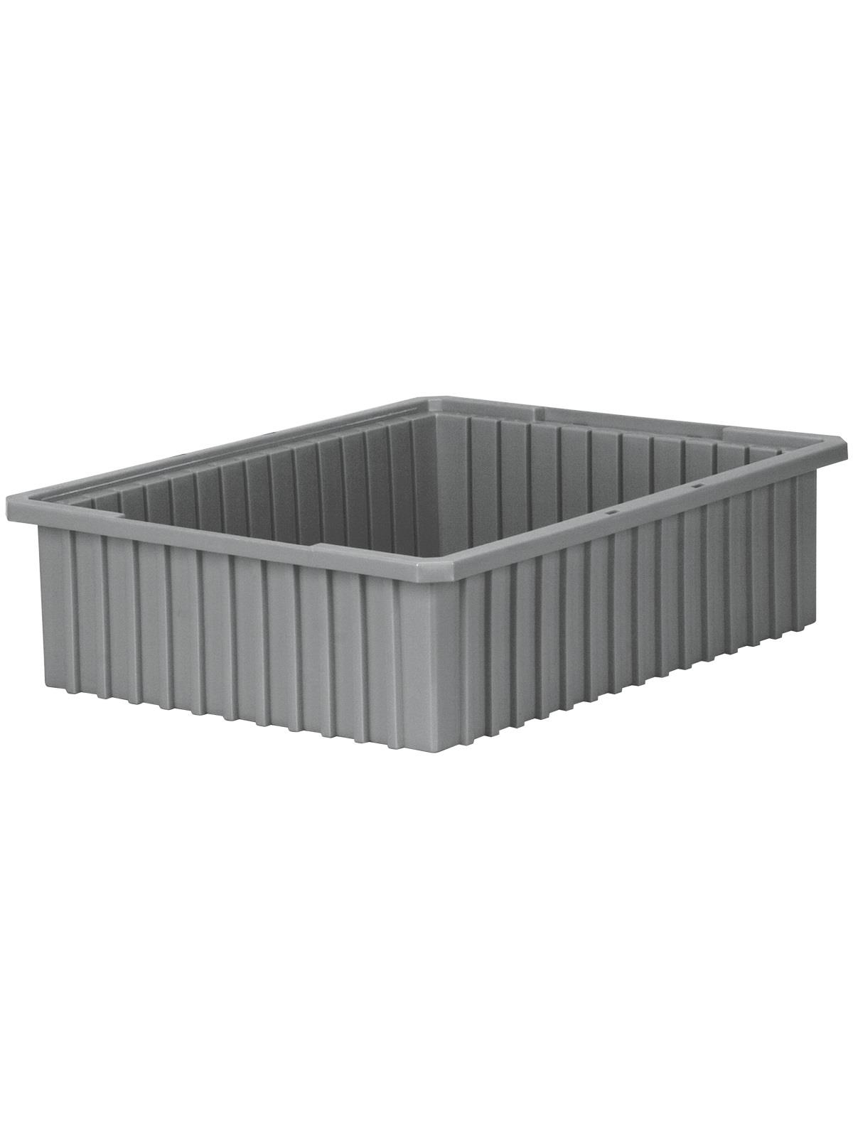 Intersecting dividers allow the container to be subdivided in separate compartments as small as 1-1/8" sq. Injection-molded from high density polyethylene -- resists most solvents and chemicals. Compatible with most racks, shelving and automated material handling equipment. Available in Red, Blue, or Gray. Dividers and lids sold separately. FOB Shipping Point.