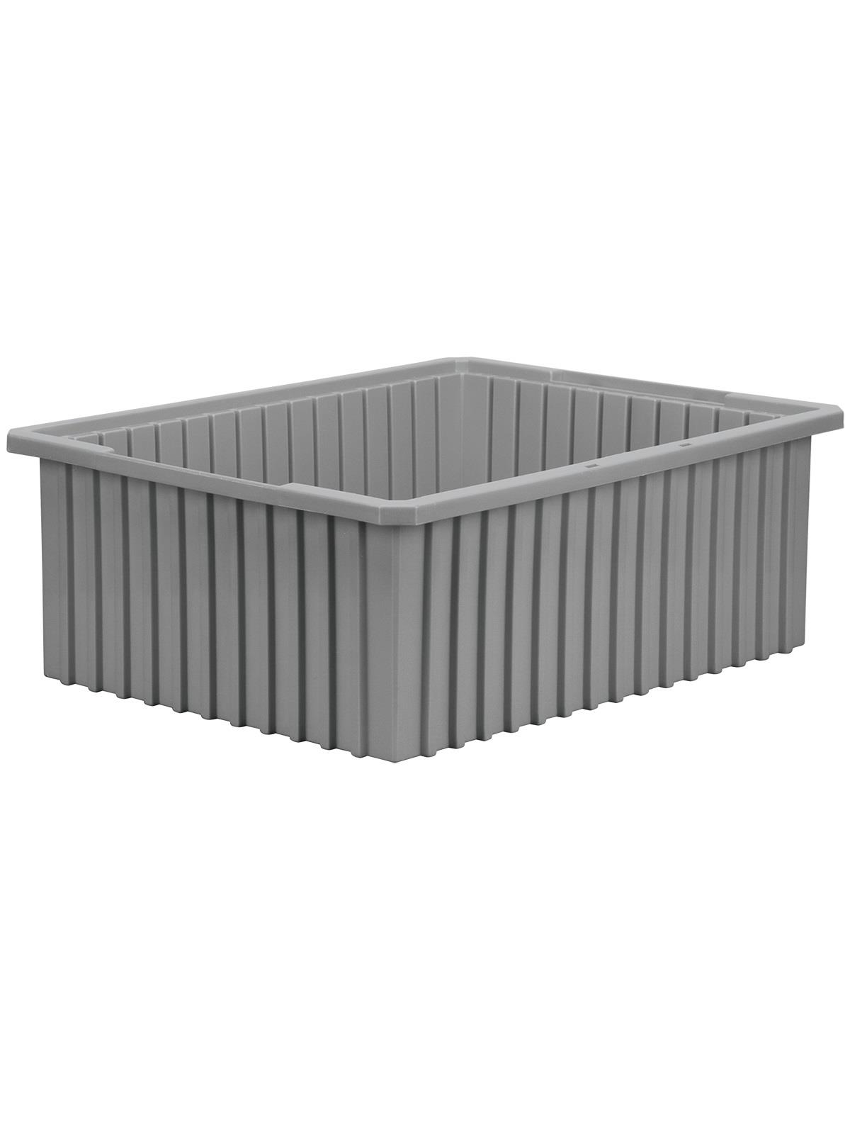 Intersecting dividers allow the container to be subdivided in separate compartments as small as 1-1/8" sq. Injection-molded from high density polyethylene -- resists most solvents and chemicals. Compatible with most racks, shelving and automated material handling equipment. Available in Red, Blue, or Gray. Dividers and lids sold separately. FOB Shipping Point.