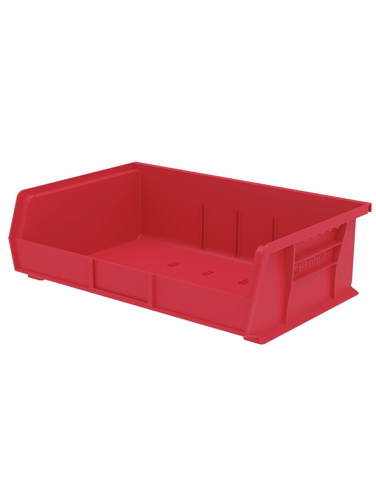 AkroBins are heavy-duty and securely stack on top of each other, sit on shelving, and hang from Akro-Mils racks, panels, rails and carts. Unaffected by weak acids and alkalis the sturdy one piece construction is water, rust and corrosion-proof. Finger grip allows for easy handling. Large label slot for easy identification of contents. Autoclavable up to 250° F. Guaranteed not to crack or break under normal load conditions as stated in the 1-year limited warranty. Optional dividers and labels available, see Related Items tab. AkroBins available in Red, Yellow, Blue, Green, Black, Stone, and Semi-Clear. FOB Shipping Point.