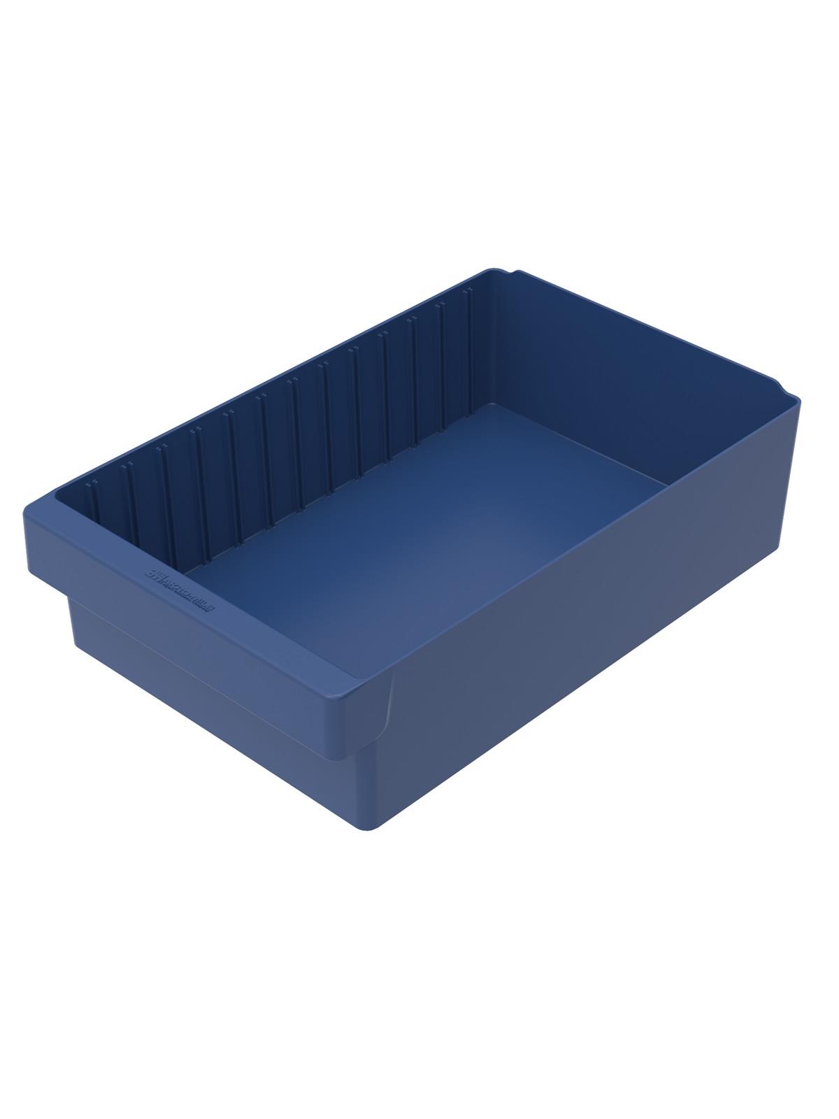 Offered in 12" or 18" depths to work with compatible shelving. Easy to label and color code inventory for quick identification of parts and supplies. Drawers can be stacked to optimize space. Wide front handle for easy gripping when AkroDrawers are loaded or contain heavy contents. Can be used with available shelving, racks, mobile carts or can be used by themselves. Sturdy back stop tab ensures AkroDrawers can hang securely from shelves. Dividers are available to keep contents neatly separated in drawers. Available in Blue, Gray, Yellow, Red and Clear - Minimum order required. FOB Shipping Point.