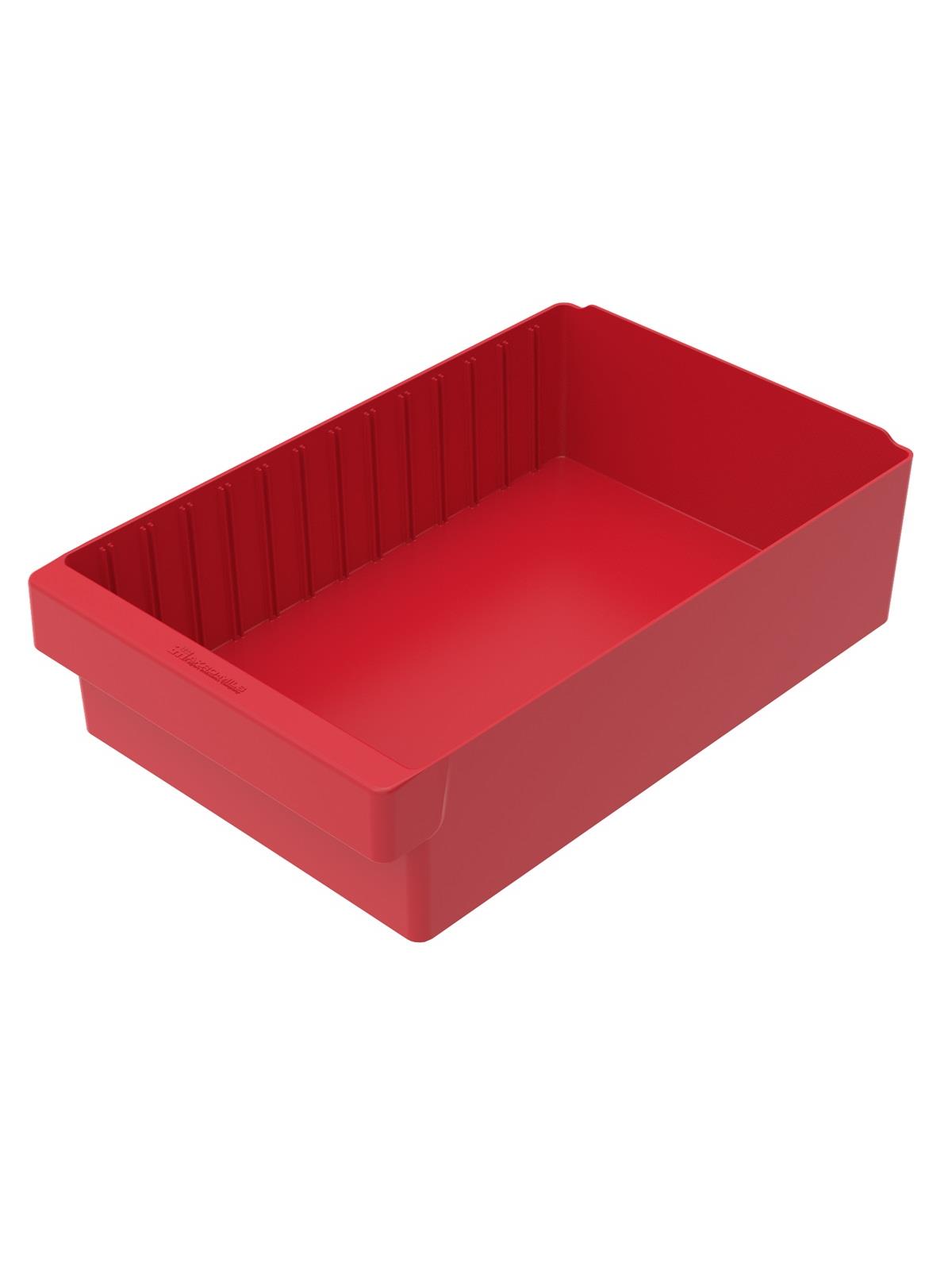 Offered in 12" or 18" depths to work with compatible shelving. Easy to label and color code inventory for quick identification of parts and supplies. Drawers can be stacked to optimize space. Wide front handle for easy gripping when AkroDrawers are loaded or contain heavy contents. Can be used with available shelving, racks, mobile carts or can be used by themselves. Sturdy back stop tab ensures AkroDrawers can hang securely from shelves. Dividers are available to keep contents neatly separated in drawers. Available in Blue, Gray, Yellow, Red and Clear - Minimum order required. FOB Shipping Point.
