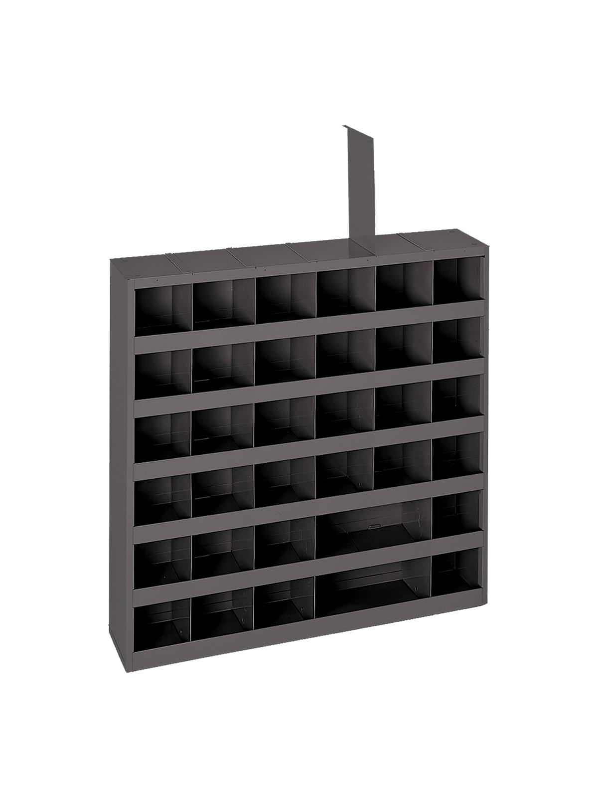 Removable vertical dividers allow the creation of double-width openings, each with scoops. Can be wall mounted.