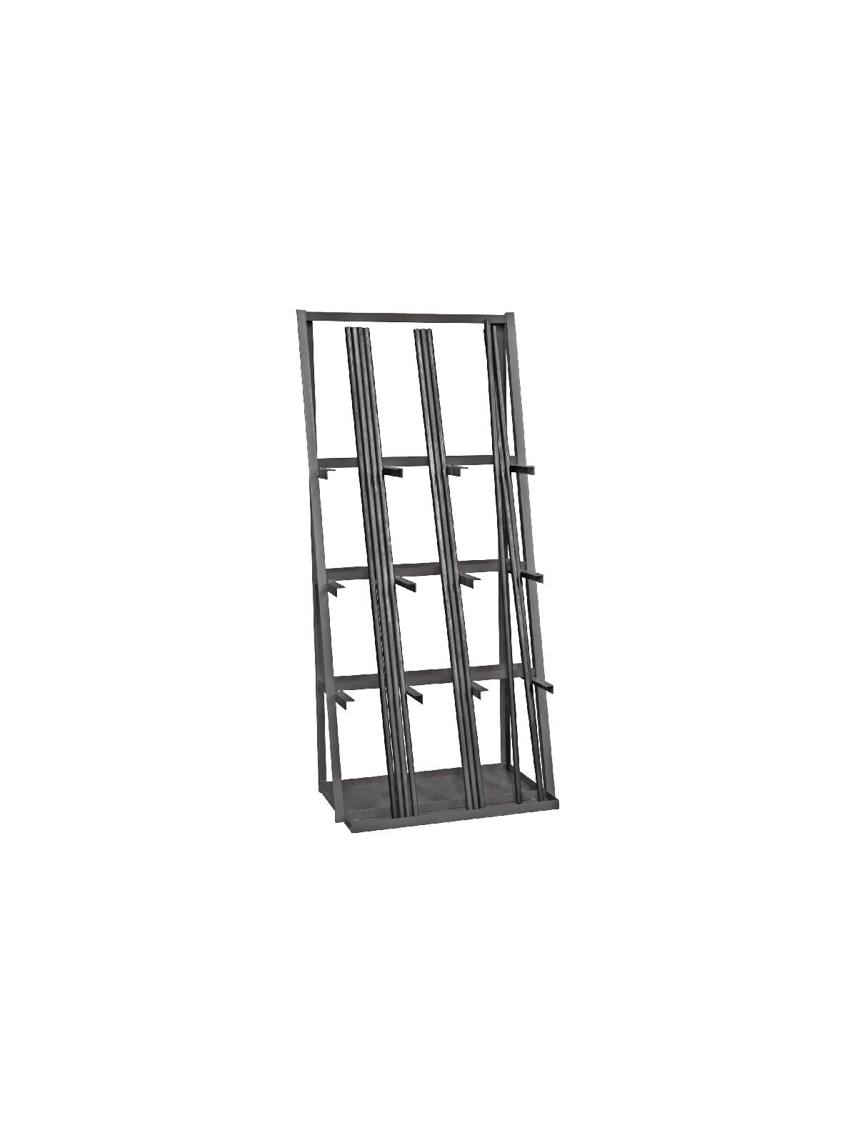 All welded construction with 3000 lbs. capacity. Heavy duty angle iron frame and arms with 14 gauge steel shelves. Shelves are 5-1/4"D. x 36" W. Pan base is 24 x 36" and has a retaining lip to hold parts in place. Perfect for storing long parts like threaded rod, pipes or strut. Unit ships fully assembled ready for use and has a durable gray textured powder coat finish.