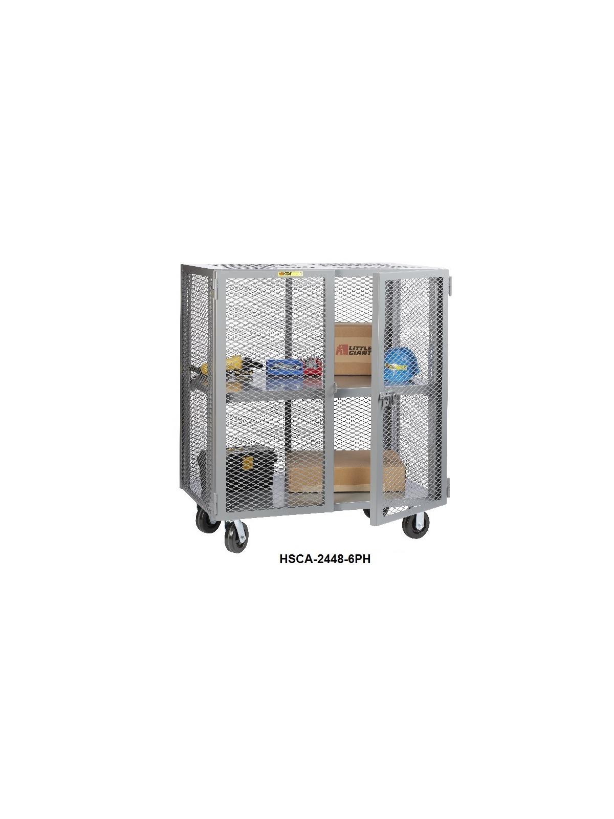 Allows good visibility and air circulation. All-welded construction handles loads up to 2,000 lbs. Double hinged doors swing open a full 270° back to the sides and out of the way. Includes padlockable hasp. Overall height is 56". Rolls smoothly on 6" x 2" phenolic casters - 2 swivel, 2 rigid. Available with fixed center shelf, or adjustable/removable shelf that adjusts on 3-1/2" increments. FOB Shipping Point.