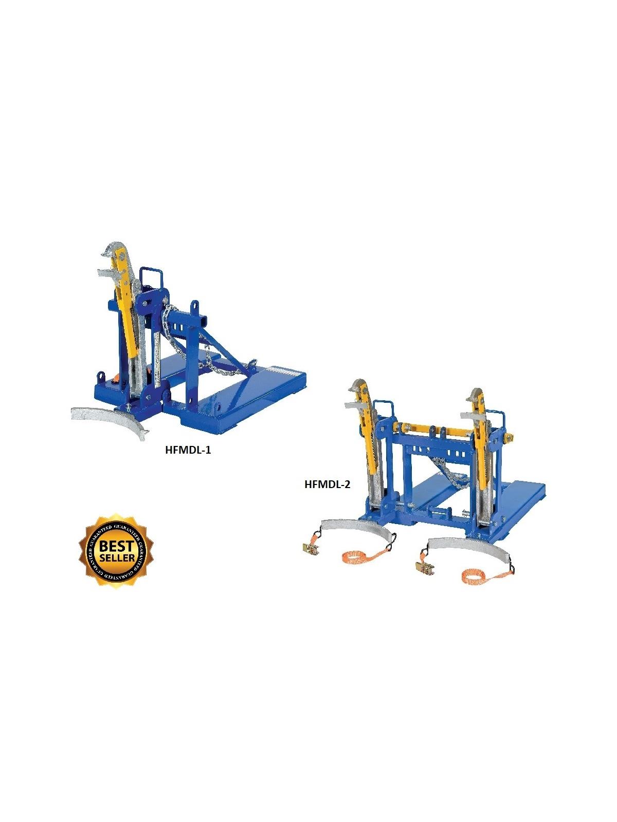 This time tested and proven design allows a fork truck operator to easily secure, move and release drums without leaving the seat of the fork truck. For use with open and closed head plastic, steel and fiber drums with a top lip strong enough to support the weight of the drum. Choose single drum or double drum configuration. Works with 30 and 55 gallon drums. All-welded sturdy construction. Low maintenance design. Includes safety chain to secure unit to carriage of fork truck. Powder coat blue finish. Fork pockets 7-1/2"W x 2-1/2"H usable. FOB Shipping Point.