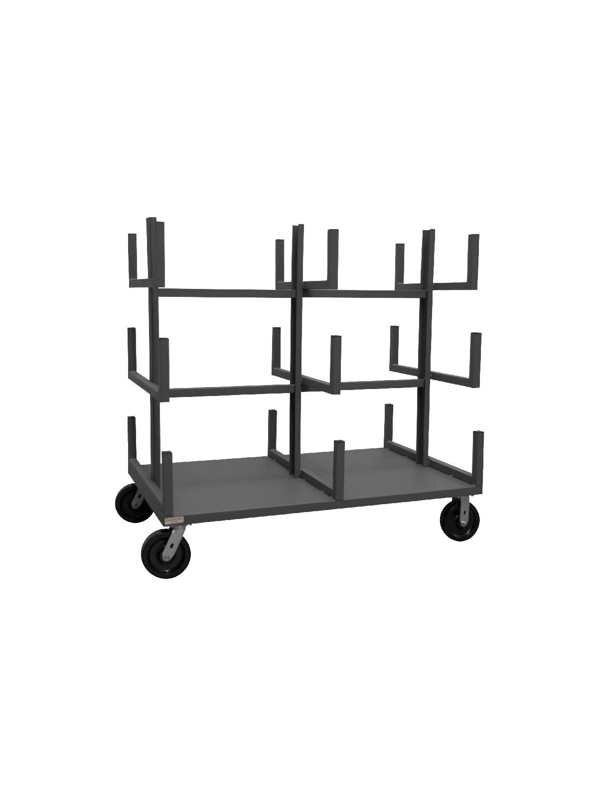 Store or transport bars, pipes, conduit and more easily. Ships fully assembled and ready for use. Deck height measures 11-1/8" above the floor. Rolls on 8 x 2" phenolic casters. Gray, textured, powder coat finish. FOB Shipping Point.