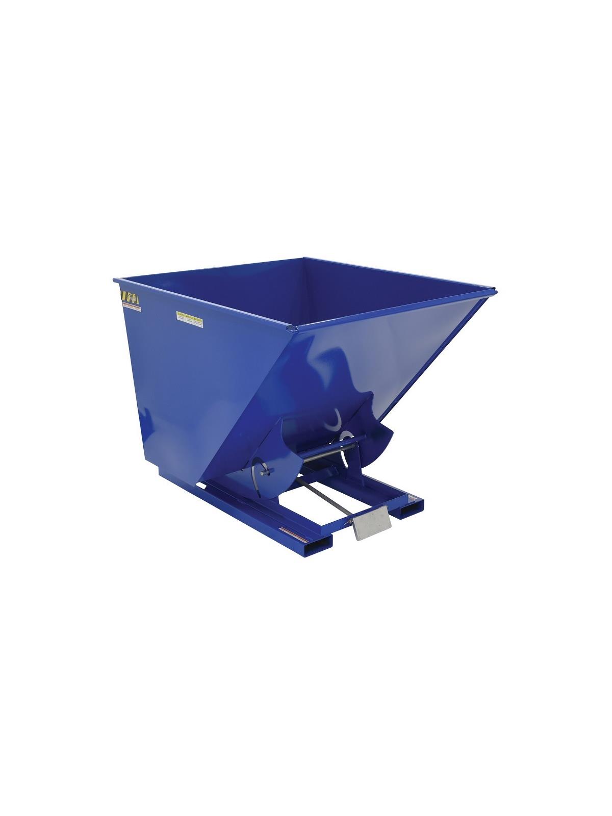 This bumper release hopper dumps as soon as the bumper is pushed. This style also returns to the locked position automatically after it dumps. A safety lock is standard on both styles to prevent accidental dumping. A safety restraint is provided to secure the hopper to the forklift. Fork pockets measure 7 1/2" x 2 1/2". Vestil self-dumping hoppers facilitate compliance with OSHA General Industry rule 29 CFR 1910.178(m)(5)(iii) by allowing lift truck operators to remain at the controls of their truck throughout the dumping process. FOB Shipping Point.
