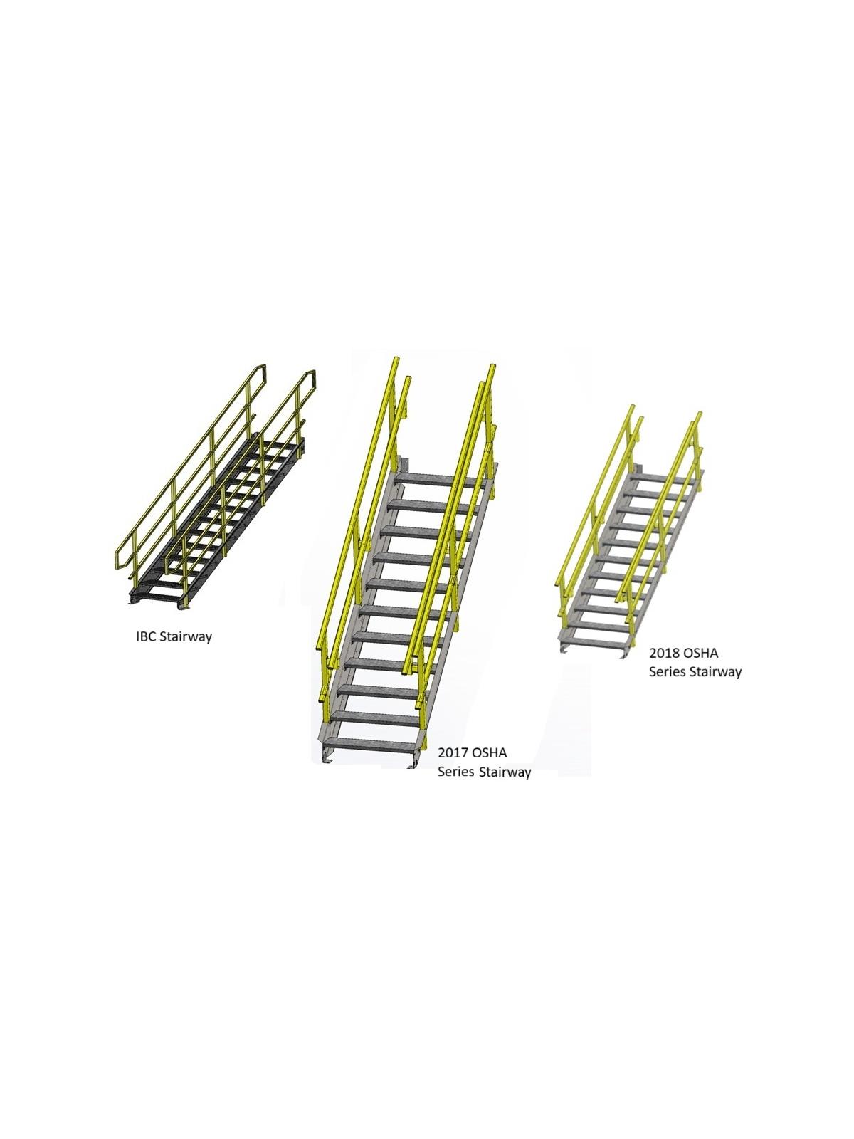 Choose from IBC Stairways (International Building Code) including New California Compliant version, 2017 OSHA Series Stairways with Internal Handrails or 2018 OSHA Series Stairways with Internal Handrails.