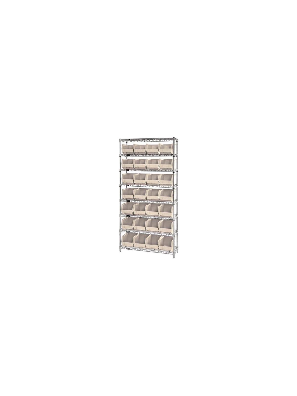 Combine stylish chrome shelving and parts organizing bins. Sturdy shelving unit supports loads up to 800 lbs. Choice of bins. Easy to assemble. Ultra Bins are available in Blue, Red, Yellow, Green, Ivory or Black. FOB Shipping Point.