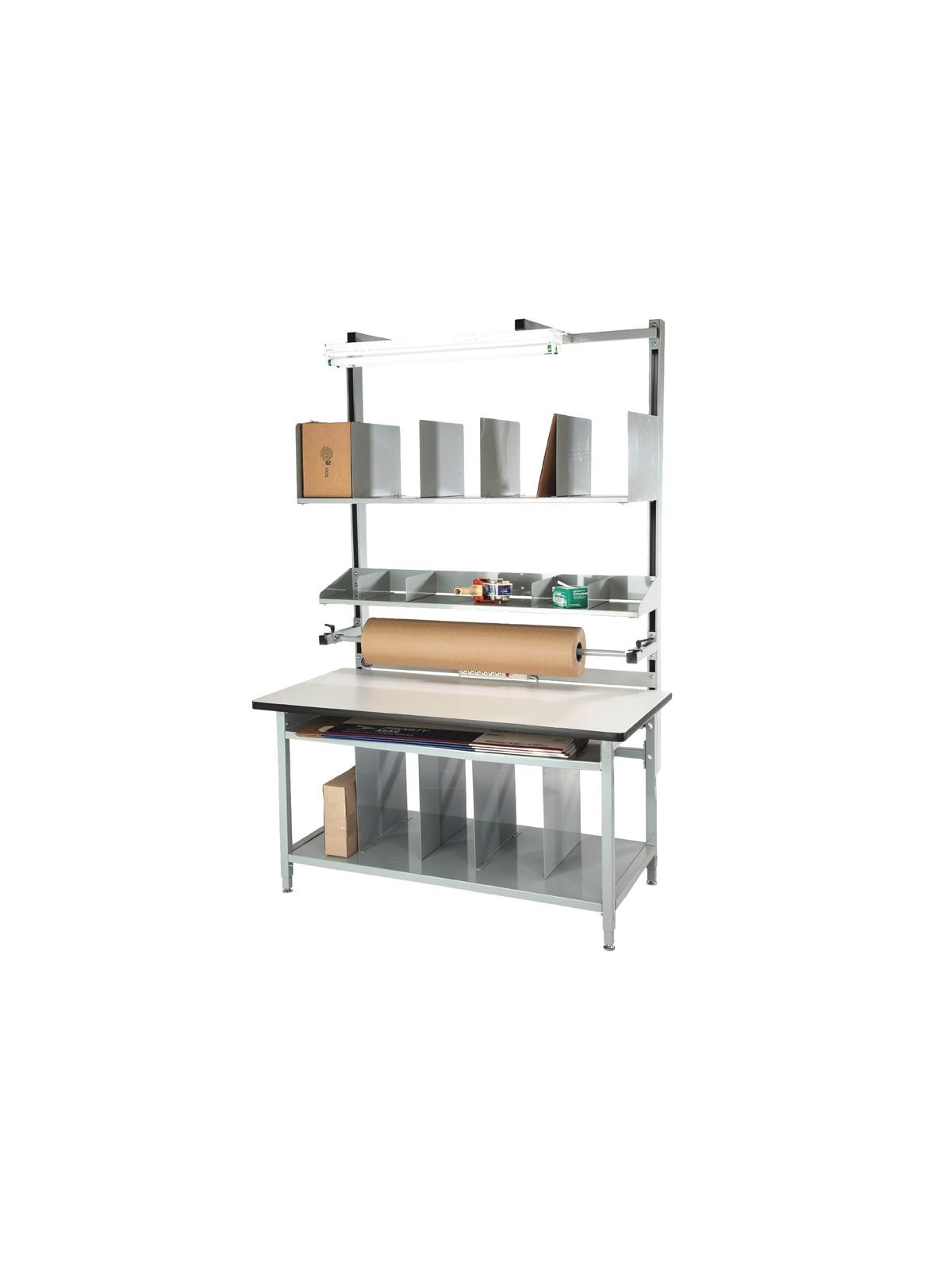 Proline's Complete Packaging Workbenches are sold with all accessories shown. Features include full lower shelf with four 18" x 18" dividers, full width storage shelf with 4" of clearance, UR72 uprights, bin holder, 6 outlet power supply, paper spool holder, enclosed metal shelf 12" deep with four 4" dividers, corrugated storage shelf with four 12" x 18" dividers, and a shop light. ESD price includes a Ground Kit. Bench height is adjustable from 30" to 36". FOB Shipping Point.