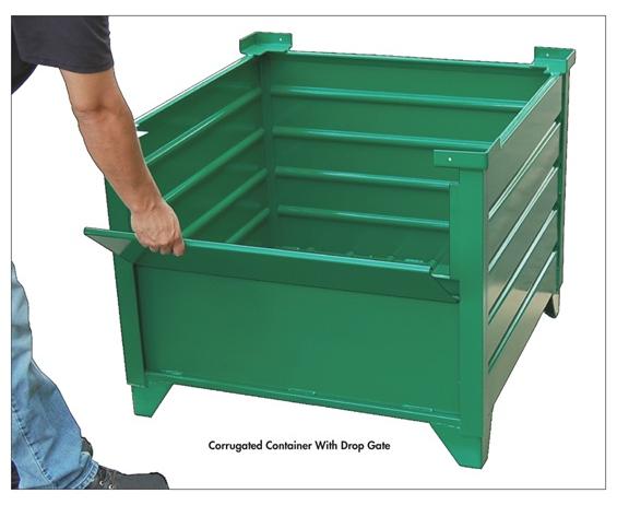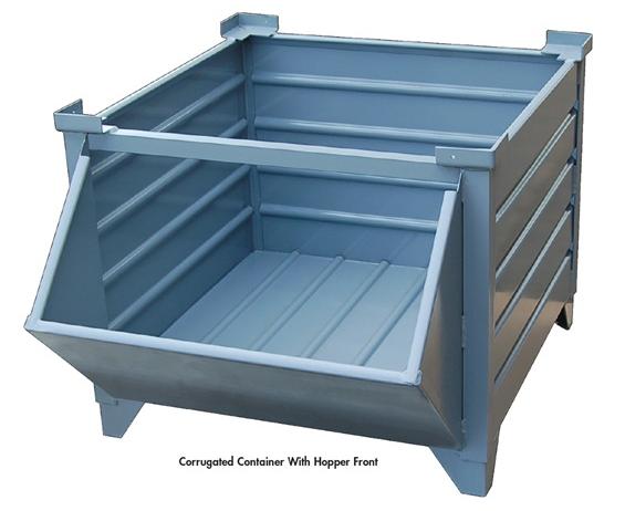 Corrugated Bulk Steel Containers are standard quick delivery units that come in many different sizes with a standard nominal inside height of 18" or 24". Constructed of 13 gauge corrugated sheet steel on all four sides, 12-13 gauge corrugated sheet steel bottom and heavy duty corner assemblies which consist of 2 x 2 x 3/16" angle iron, 7 gauge stacking targets and 4" legs. Sides and bottom are designed to contain a maximum of 4,000 lbs. of bulk material and the corner assemblies are designed to hold fully loaded units stacked five high. All welded combination will provide dependable use for years. All units come standard with a one year workmanship warranty. FOB Shipping Point.
