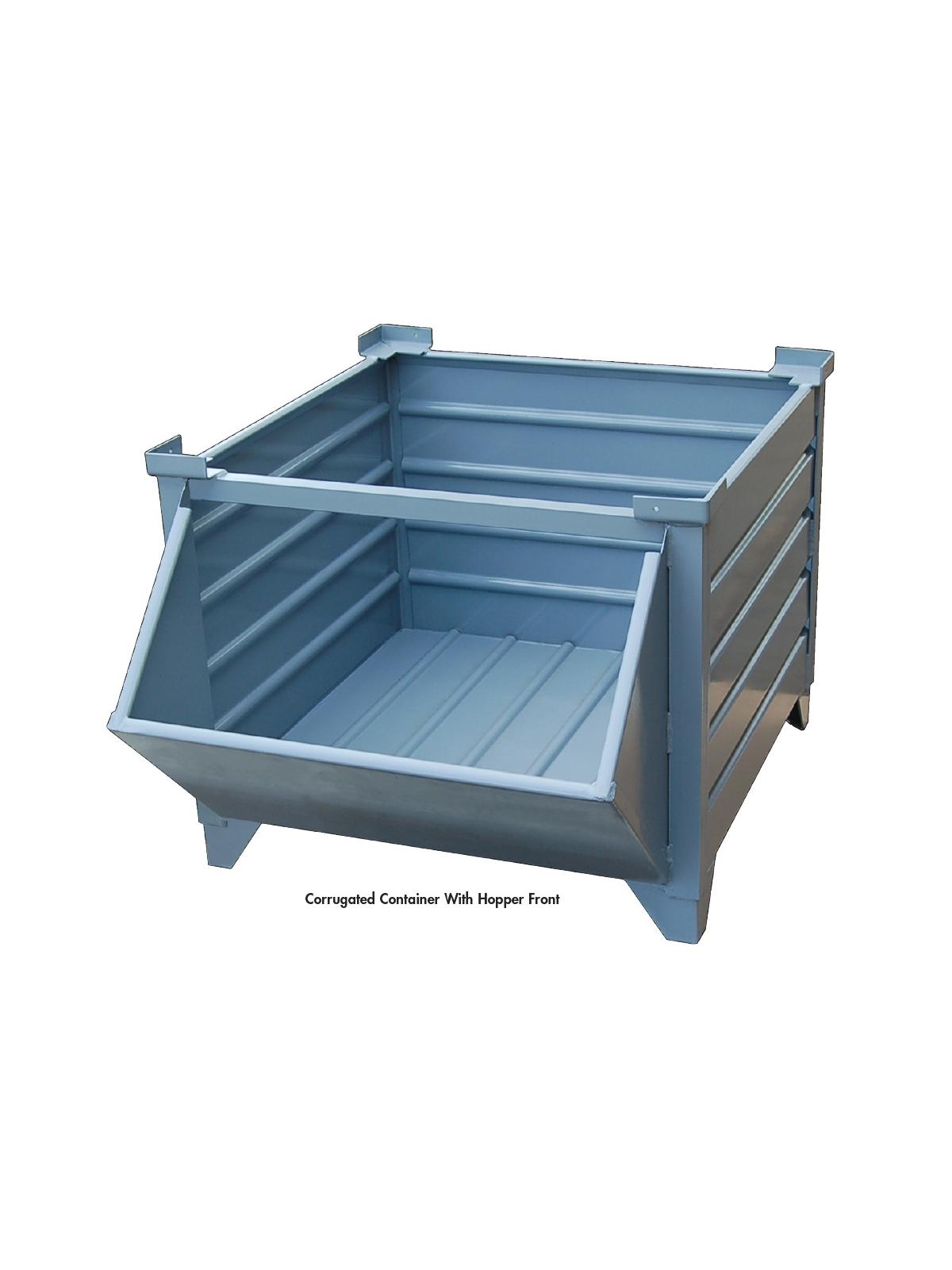 Corrugated Bulk Steel Containers are standard quick delivery units that come in many different sizes with a standard nominal inside height of 18" or 24". Constructed of 13 gauge corrugated sheet steel on all four sides, 12-13 gauge corrugated sheet steel bottom and heavy duty corner assemblies which consist of 2 x 2 x 3/16" angle iron, 7 gauge stacking targets and 4" legs. Sides and bottom are designed to contain a maximum of 4,000 lbs. of bulk material and the corner assemblies are designed to hold fully loaded units stacked five high. All welded combination will provide dependable use for years. All units come standard with a one year workmanship warranty. FOB Shipping Point.