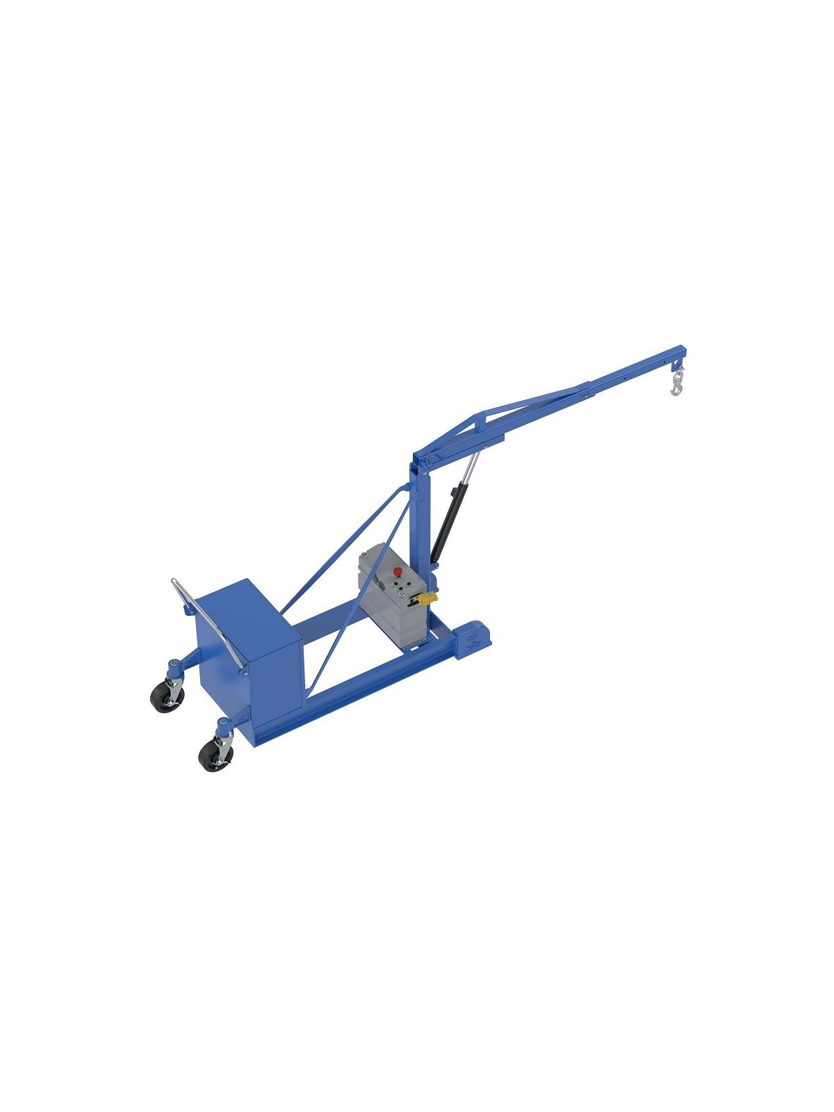 This crane has an adjustable boom to allow for maximum adjustments and versatility to lift a variety of loads. The boom is raised with a manual hydraulic hand pump or a push of a button on DC powered units. The boom also telescopes out for a greater reach. The counterbalance design eliminates the need for front legs, making the unit easier to maneuver and ideal for reaching tight, hard to reach areas. Units roll on two (2) rigid 8" x 2" glass-filled nylon and two (2) swivel 8" x 3" phenolic casters with side brake. FOB Shipping Point.