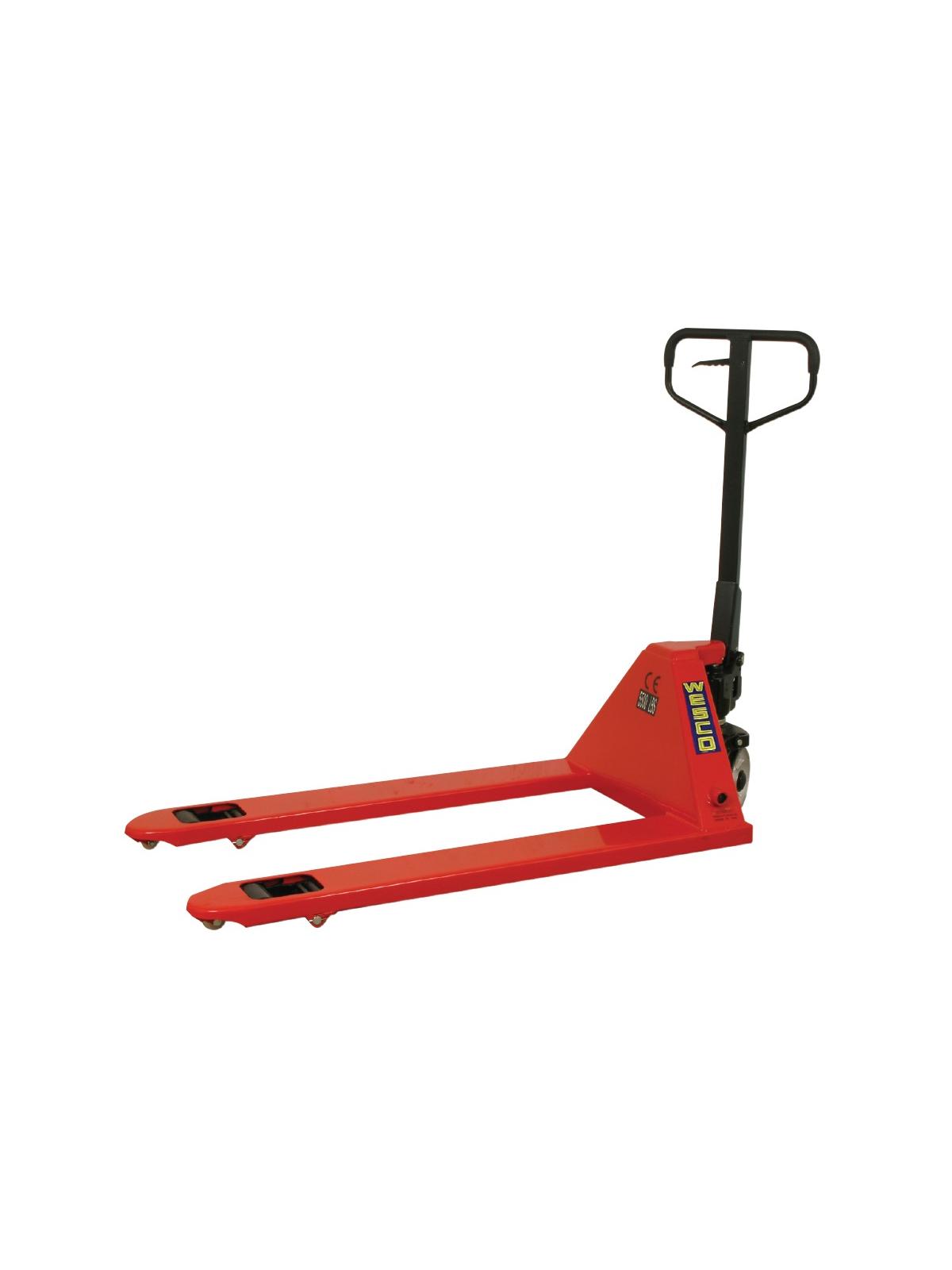 Lifts loads up to 5,500 lbs. Features overload bypass, rubber coated handle, adjustable fork connecting rods, entry and exit rollers, 7" mold-on polyurethane steering wheels, 210° steering. 6"W. forks. 7.25" raised height. 2.9" lowered height. FOB Shipping Point.