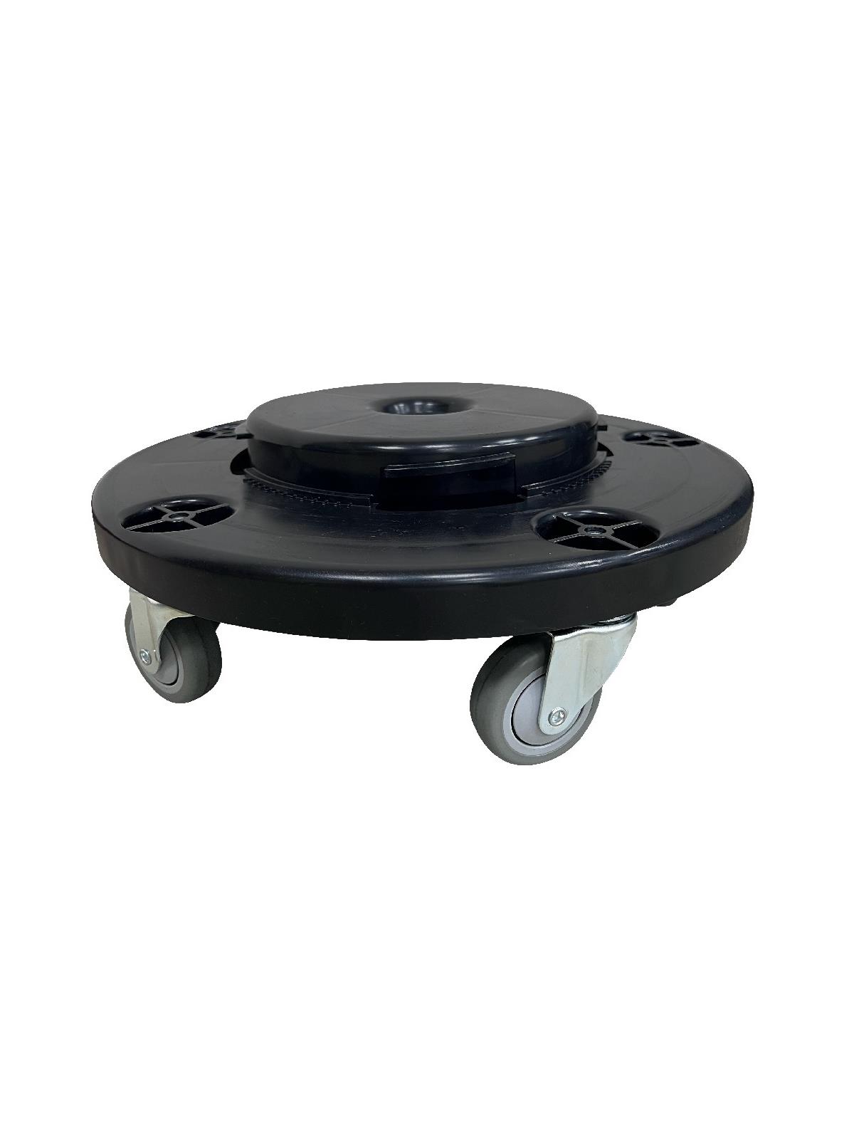 Quiet Dolly - Twist lock design ensures trash cans fit tight and secure. 5 swivel 3 x 1" thermoplastic rubber casters (non-marking/silent). Ensures effortless transport and quiet movement over all surfaces when handling facility waste.