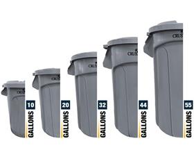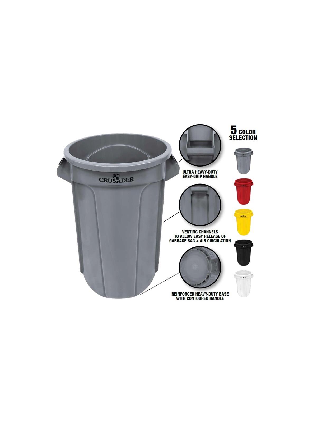 Our heavy-duty CRUSADER Round Trash Cans feature a proprietary design crafted from premium polymer resin, including a UV inhibitor, ensuring durability and longevity, even in the harshest commercial and insutrial environments. FOB Shipping Point.