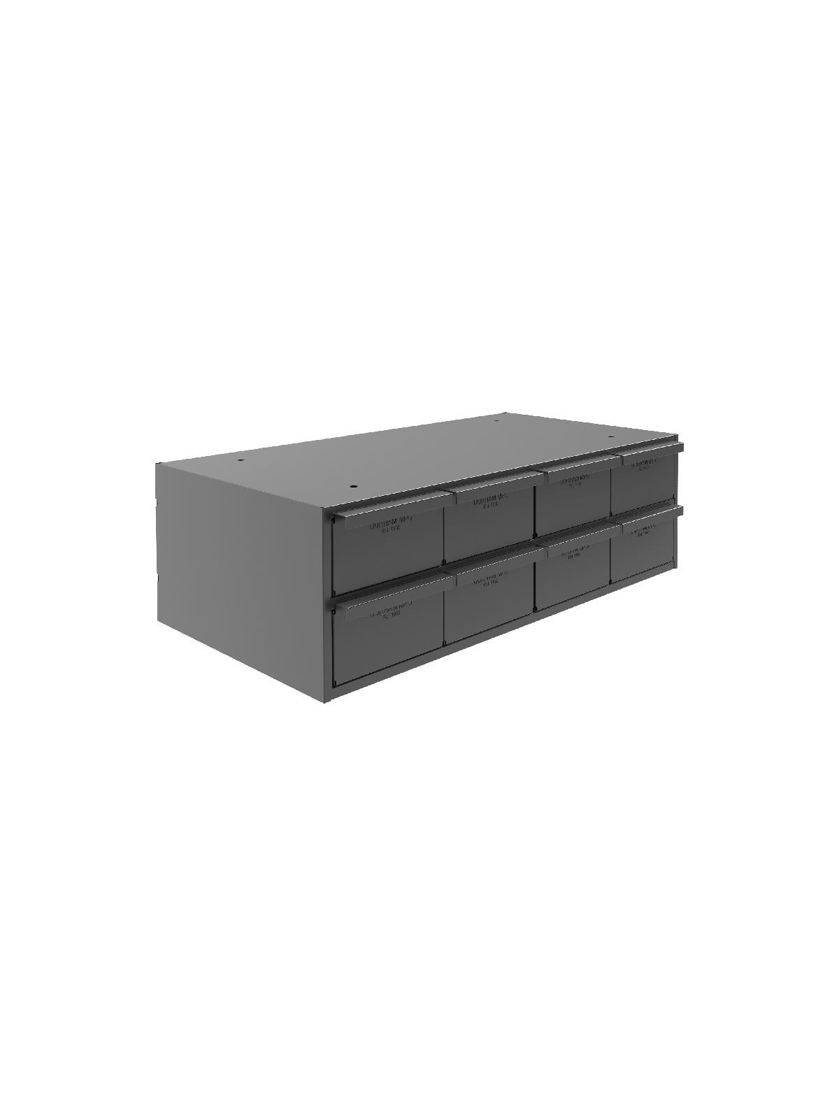 All-welded heavy-duty frame features vertical support for extra stacking strength. A positive stop mechanism prevents drawers from falling out. Drawers also feature double interlocked design for additional rigidity. Full-width handles for a firm grip. Each drawer complete with 2 adjustable dividers. Extra dividers sold below. Fits standard shelving. Finished in rust and acid resistant Gray powder coat. Fully assembled. FOB Shipping Point.