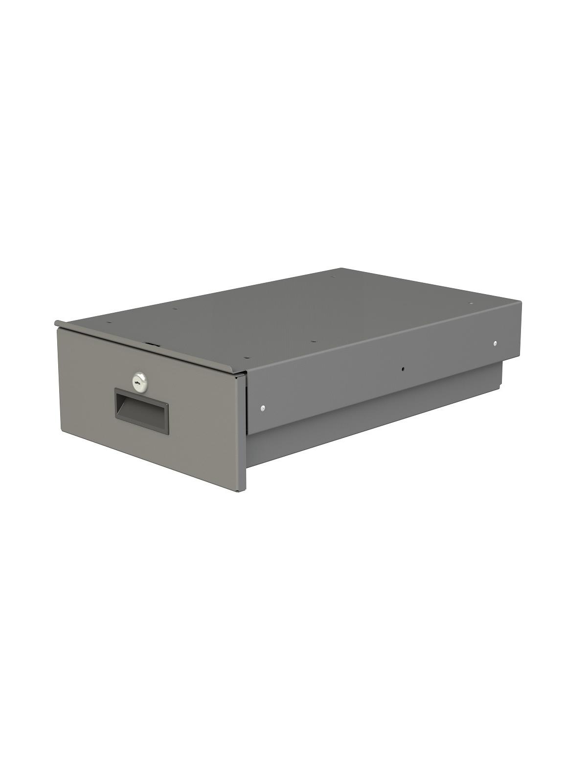 All steel construction. Attaches to underside of work surface using predrilled holes. Opens and closes easily on ball bearing glides. Recessed handle, lock and 2 keys provided. Drawer is fully enclosed in a 14-5/16"W x 19-13/16"D x 6-3/16"H case. FOB Shipping Point.