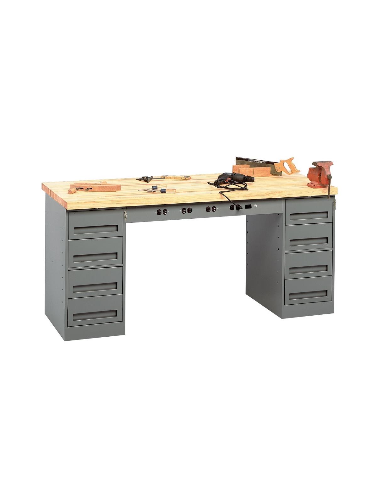 Drawers have an adjustable divider.  Full depth shelf in door cabinet is adjustable in 1-1/8" increments. Front panel has knockouts for four duplex outlets and a switch (order optional wiring kit - See Related Items tab). Choice of tops: 1-3/4" thick solid hardwood butcher-block top or 1-1/2" thick steel top. Shipped unassembled (cabinets may be installed on either side). Medium gray. FOB Shipping Point.