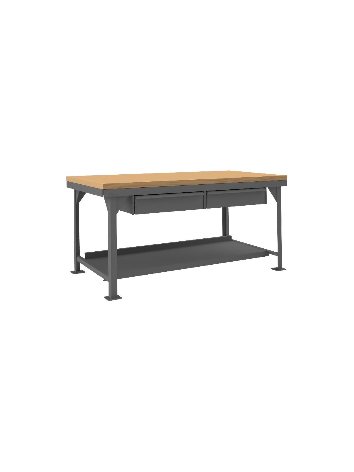 Products with top shelf risers used as shelf and back splash. See Related Items tab for Drawer for Durham Work Benches.