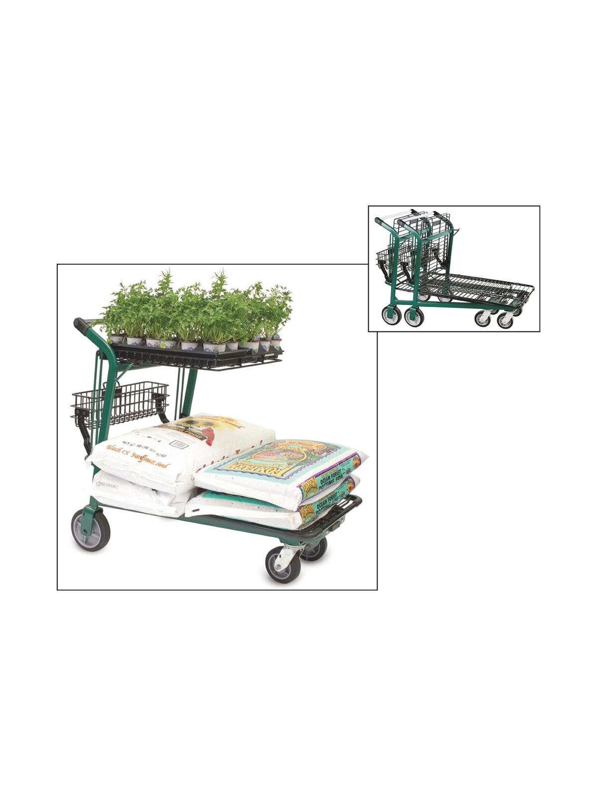 This rugged lawn & garden and feed store cart is made for rough terrain with heavy duty 8" rear and 6" front wheels. Top shelf accommodates full flats and retracts to allow for large or bulky items. Weight capacity of up 1,200 lbs. Nests in only 10". Available in Dark Gray/Black or Green/Black. FOB Shipping Point.